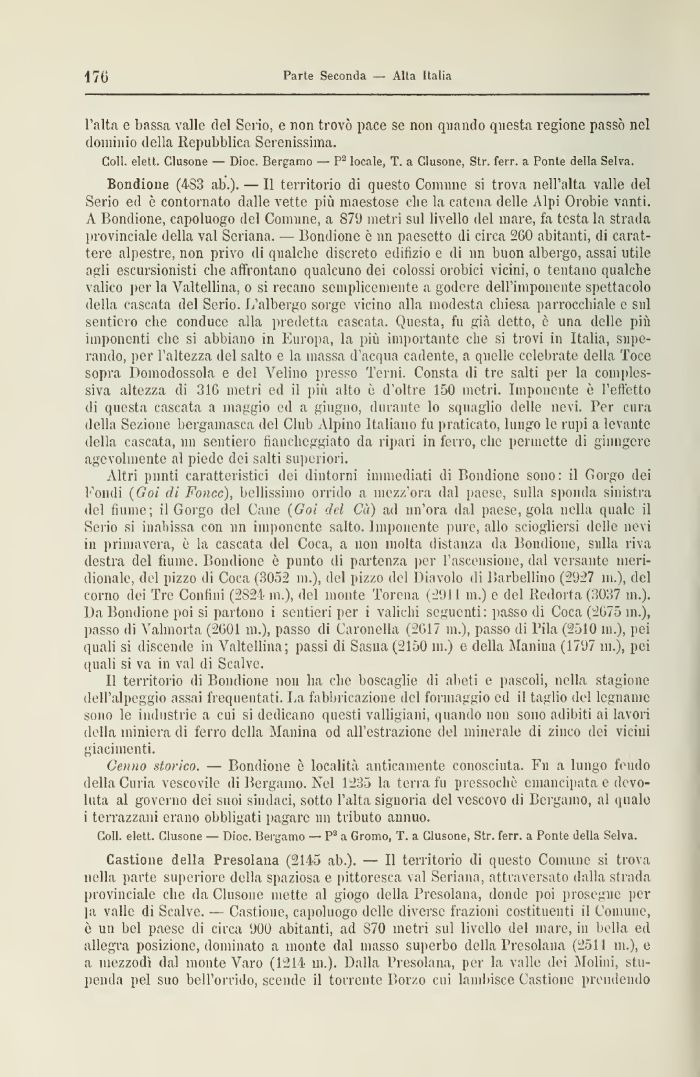Boixdione (4S3 ab.). — Il territorio di questo Connine si trova nell'alta valle del Serio ed ò contornato dalle vette più maestose che la catena delle Alpi Orobie vanti. A Bondione, capoluogo del Connine, a 879 metri sul livello del mare, fa testa la strada provinciale della vai Seriana. — Bondione ò 1111 paesetto di circa 260 abitanti, di carattere alpestre, non privo di qualche discreto edilizio e di mi buon albergo, assai utile agli escursionisti che affrontano qualcuno dei colossi orobici vicini, o tentano qualche valico per la Valtellina, o si recano semplicemente a godere dell'imponente spettacolo della cascala del Serio. L'albergo sorge vicino alla modesta chiesa parrocchiale e sul sentiero che conduce alla predetta cascata. Questa, fu già detto, è una delle più imponenti che si abbiano ni Europa, la più importante che si trovi in Italia, superando, per l'altezza del salto e la massa d'acqua cadente, a quelle celebrate della 'foce sopra Domodossola e del Velino presso Terni. Consta di tre salti per la complessiva altezza di 316 metri ed il più alto è d'oltre 150 metri. Imponente è l'effetto di questa cascata a inaggio ed a giugno, durante lo squaglio delle nevi. Per cura della Sezione bergamasca del Club Alpino Italiano fu praticato, lungo le rupi a levante della cascata, nn sentiero fiancheggiato da ripari in ferro, che permette di giungere agevolmente al piede dei salti superiori.