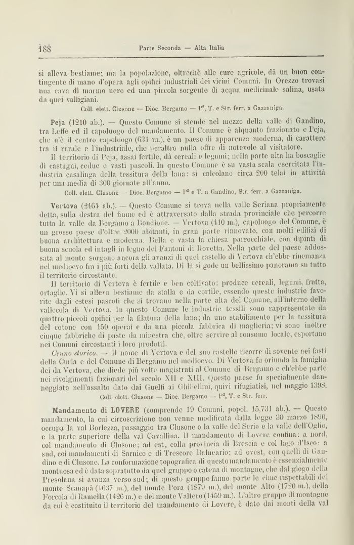 Peja (1210 ab.). — Questo Comune si stende nel mezzo della valle di Gandino, tra Lette ed il capoluogo del mandamento. 11 Connine è alquanto frazionato e I'eja, che n'è il centro capoluogo (031 ni.), è un paese di apparenza moderna, di carattere tra il rurale e l'industriale, che peraltro nulla offre di notevole al visitatore.