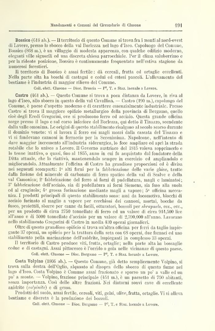 Castro (461 ab.). — Questo Comune si trova a poca distanza da Lovere, in riva al lago d'Iseo, allo sbocco in questo della vai Cavallina. — Castro (190 m.), capoluogo del Comune, è paese d'aspetto moderno e di carattere essenzialmente industriale. Presso Castro si trova il maggiore opifizio metallurgico della provincia di Bergamo, quello cioè degli Eredi Gregorini, ove si producono ferro ed acciaio. Questa grande officina sorge presso il lago e sul corso inferiore del Borlezza, qui detto il Tinazzo, scendente dalla valle omonima. Le origini di questo stabilimento risalgono al secolo scorso durante il dominio veneto: vi si lavora il ferro coi magli mossi dalla cascata del Tinazzo e vi si fondevano cannoni in ferraccio per la Serenissima. Napoleone, nell'intento di dare maggior incremento all'industria siderurgica, lo fece ampliare ed aprì la strada rotabile che lo unisce a Lovere. Il Governo austriaco del 1815 voleva sopprimerlo e lo tenne inattivo, o quasi, fino al 1855, anno in cui fu acquistato dal fondatore della Ditta attuale, che lo riattivò, mantenendolo sempre in esercizio ed ampliandolo e migliorandolo. Attualmente l'officina di Castro ha grandiose proporzioni ed è divisa nei seguenti scomparti: 1° alti forni per la fabbricazione delle varie ghise, tratte dalla fusione del minerale di carbonato di ferro spatico della vai di Scalve e della vai Canionica; 21 fabbricazione del ferro ai forni di pudellatura, magli e laminatoi; 3° fabbricazione dell'acciaio, sia di pudellatura ai forni Siemens, sia fnso alla suola ed al crogiuolo; 49 grossa fucinazione mediante magli a vapore; 5° officina meccanica. I prodotti principali di questo stabilimento sono: assi da locomotiva, blocchi di acciaio fucinato al maglio a vapore per cerchioni dei cannoni, mortai, bocche da fuoco, proiettili, sbarre per canne da fucili, otturatori, bossoli per shrapnels, ecc., ecc., per un prodotto di circa 2750 tonnellate di ferro ed un valore di circa 914,500 lire all'anno e di 5000 tonnellate d'acciaio per un valore di 2,390,000 all'anno. Lavorano nello stabilimento Gregorini di Castro in media 430 operai giornalieri.