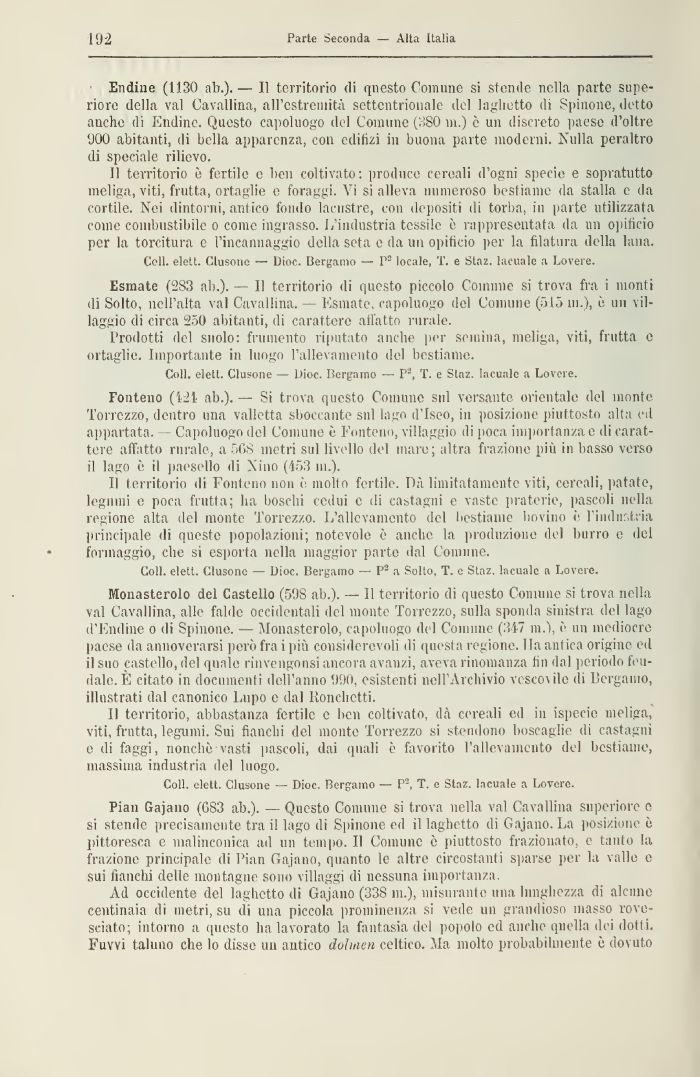 Endine (1130 alt.).— Il territorio di questo Comune si stende nella parte superiore della vai Cavallina, all'estremità settentrionale del laghetto di Spinone, detto nuche di Endine. Questo capoluogo del Comune (380 ni.) è un discreto paese d'oltre 900 abitanti, di bella apparenza, con edilizi in buona parte moderni. Nulla peraltro di speciale rilievo.