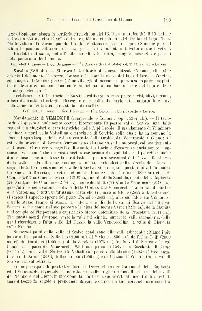 Mandamento di VILMINORE (comprende 5 Comuni, popol. 5397 ab.). — Il territorio di questo mandamento occupa interamente l'alpestre vai di Scalve: una delle regioni più singolari e caratteristiche delle Alpi Orobie. 11 mandamento di Vilminore confina: a nord, colla Valtellina o provincia di Sondrio, colla quale ha in comune la linea di spartiacque della catena centrale delle Orobie, dal Venerocolo al Giono; ad est, colla provincia di Brescia (circondario di Bromo); a sud e ad ovest, col mandamento di Clusone. Carattere topografico di questo territorio è d'essere essenzialmente montuoso; esso non è che un vasto bacino contornato da ogni lato e si potrebbe, anche dire chiuso — se non fosse la strettissima apertura scavatasi dal Dezzo allo sbocco della valle — da altissime montagne. Infatti, partendosi dalla stretta del Dezzo e seguendo tutto il contorno della valle di Scalve, si hanno, tra questa e la vai Camonica (provincia di Brescia), le vette del monte Planezzo, del Costone (1830 in.), cima di Camino(2492 m.); monte Sossino (2103 ni.), monte della Zendola, monte della Baghetta (2409 m.),.monte Campione (2174 in.), monte del Matto (2407 in.) e Venerocolo (2590 ni.), quest'ultimo nella catena centrale delle Orobie. Dal Venerocolo, tra la vai di Scalve e la Valtellina, è tutta un'altissima costa che si unisce al Giono (2852 ni.). Dal Giono, si stacca il superbo sprone del pizzo Tornello (2088 ni.), alle cui falde sta Vilminore, e nello stesso tempo si stacca la catena che divide la vai di Scalve dall'alta vai Seriana e che conta nel suo percorso le cime del monte Sasna (2229 ni.), della Manina e si compie coll'imponente e capriccioso blocco dolomitico della Presolana (251! in.). Tra questi monti s'aprono, verso la valle principale, numerose valli secondarie, delle quali ricorderemo l'alta valle del Dezzo, la valle Venerocolina, la valle di Gleno, la valle Nembo.