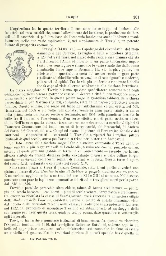 La piazza maggiore di Trevigėio č uno spazioso quadrila ( ero contornato da begli edifizi, con porticati o senza; potrebbe essere di decoro a cittā di ben maggiore importanza quanto a popolazione. In questa piazza sorge la grandiosa fabbrica della chiesa parrocchiale di San Martino (fėg. 2'J), collegiata, retta da un parroco preposto e vicario foraneo. Questo edilizio, che sorge sul luogo dell'antichissima chiesa eretta nel 50!), ricostruita nel 1008 e pių volte raffazzonata, venne in gran parte rifatto a nuovo nella prima metā del nostro secolo e terminato, nel 1841, colla grandiosa facciata in istile tra il barocco e l'accademico, d'un certo effetto, ma di gusto artistico discutibile. Nell'interno questa chiesa, riccamente ornata e decorata, ha eccellenti dipinti di Francesco Corona, uno dei buoni secentisti bergamaschi, dei Procaccini, di Andrea del Sarto, dei Caracci, del cav. Campi ed avanzi di pitture di Bernardino Zenale e del Buttinoni cinquecentisti entrambi di Trevigėio e riputati fra i migliori pittori lombardi di quel secolo, aureo per l'arte e sė triste per la storia in Lombardia.
