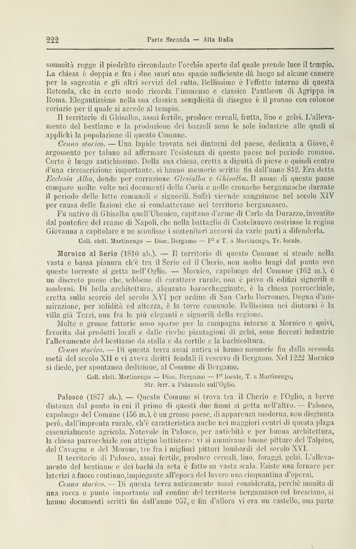 Palosco (1877 ab.). — Questo Comune si trova tra il Cherio e l'Oglio, a breve distanza dal punto incui il primo di questi due tinnii ni getta nell'altro. - Palosco, capoluogo del Comune (15G 111.), è 1111 grosso paese, ili apparenza moderna, 11011 disgiunta però, dall'impronta rurale, cli'ò caratteristica anche nei maggiori centri di questa plaga essenzialmente agricola. Notevole in Palosco, per antichità e per buona architettura, la chiesa parrocchiale con attiguo battistero: vi si ammirano buone pitture del l'alpino, del Cavagna e del Morone, tre fra i migliori pittori lombardi del secolo X\ I.