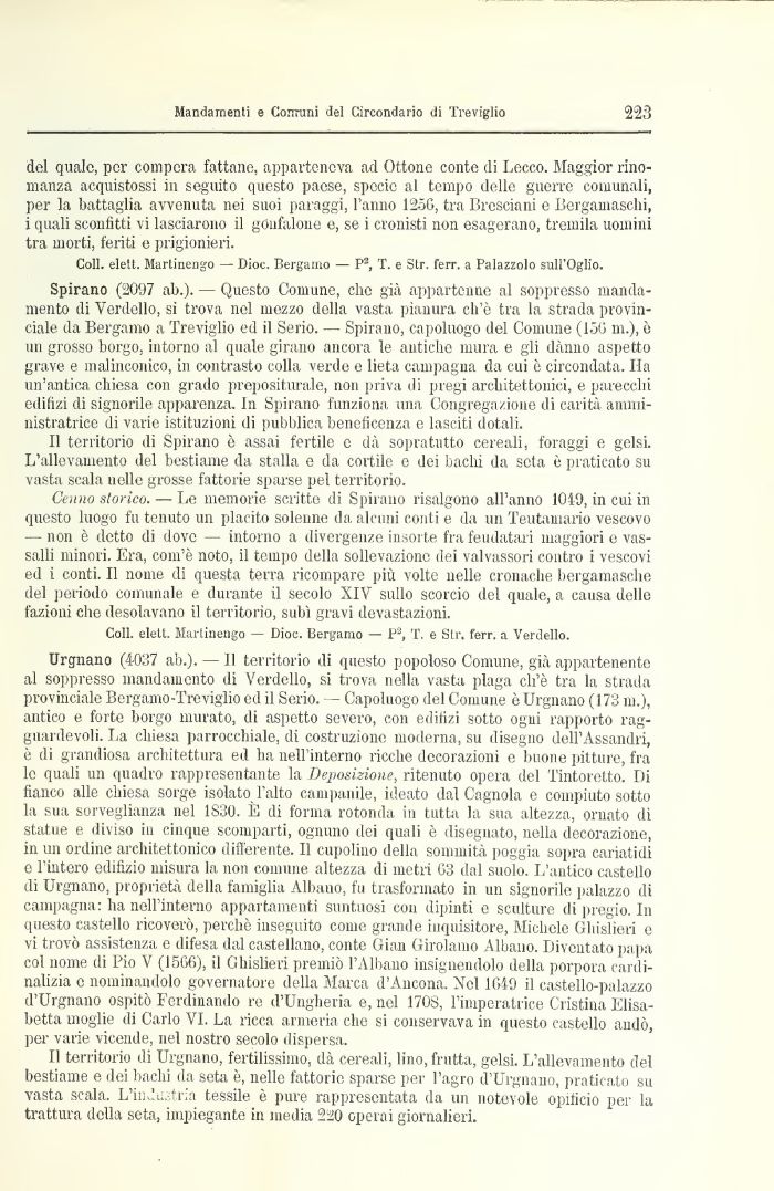 Spirano (2097 ab.). — Questo Comune, clic già appartenne al soppresso mandamento di Verdello, sì trova nel mezzo della vasta pianura ch'è tra la strada provinciale da Bergamo a Treviglio ed il Serio. — Spirano, capoluogo del Comune (150 m.), è un grosso borgo, intorno al quale girano ancora le antiche mura e gli dànno aspetto grave e malinconico, in contrasto colla verde e lieta campagna da cui è circondata. Ha un'antica chiesa con grado prepositurale, non priva di pregi architettonici, e parecchi edilìzi di signorile apparenza. In Spirano funziona una Congregazione di carità amnii-nistratrice di varie istituzioni di pubblica beneficenza e lasciti dotali.