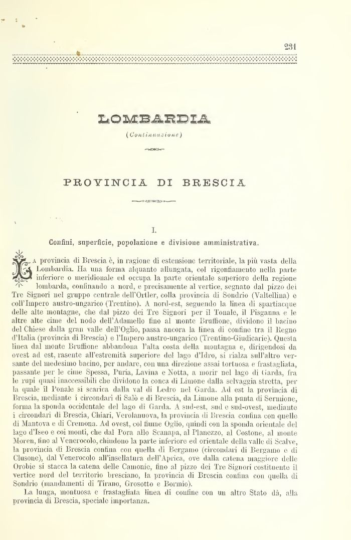 a provincia di Brescia è, in ragione di estensione territoriale, la più. vasta della JIlr«i Lombardia. Ha una forma alquanto allungata, col rigonfiamento nella parte inferiore o meridionale ed occupa la parte orientale superiore della regione lombarda, confinando a nord, e precisamente al vertice, segnato dal pizzo dei Tre Signori nel gruppo centrale dell'Or ti er, colla provincia di Sondrio (Valtellina) e coli'Impero austro-ungarico (Trentino). A nord-est, seguendo la linea di spartiacque delle alte montagne, che dal pizzo dei Tre Signori per il Tonale, il Pisganna e le altre alte cime del nodo dell'Adamello fino al monte Bruffione, dividono il bacino del Chiese dalla gran valle dell'Oglio, passa ancora la linea di confine tra il Regno d'Italia (provincia di Brescia) e l'Impero austro-ungarico (Trentino-Giudicarie). Questa linea dal monte Bruffione abbandona l'alta costa della montagna e, dirigendosi da ovest ad est, rasente all'estremità superiore del lago d'Idro, si rialza sull'altro versante del medesimo bacino, per andare, con una direzione assai tortuosa e frastagliata, passante per le cime Spessa, l'uria, Lavina e Notta, a morir nel lago di Garda, fra le rupi quasi inaccessibili che dividono la conca di Limone dalla selvaggia stretta, perla quale il Penale si scarica dalla vai di Ledro nel Garda. Ad est la provincia di Brescia, mediante i circondari di Salò e di Brescia, da Limone alla punta di Serniione, forma la sponda occidentale del lago di Garda. A sud-est, sud e sud-ovest, mediante i circondari di Brescia, Chiari, Verolanuova, la provincia di Brescia confina con quelle di Mantova e di Cremona. Ad ovest, col fiume Oglio, quindi con la sponda orientale del lago d'Iseo e coi monti, che dal Fora allo Scanapa, al Planezzo, al Costone, al monte Moren, lino al Venerocolo, chiudono la parte inferiore ed orientale della valle di Scalve, la provincia di Brescia confina con quella di Bergamo (circondari di Bergamo e di Clusone), dal Venerocolo all'insellatura dell'Aprica, ove dalla catena maggiore delle Orobie si stacca la catena delle Cainonie, fino al pizzo dei Tre Signori costituente il vertice nord del territorio bresciano, la provincia di Broscia confina con quella di Sondrio (mandamenti di Tirano, Grosotto e Bormio).