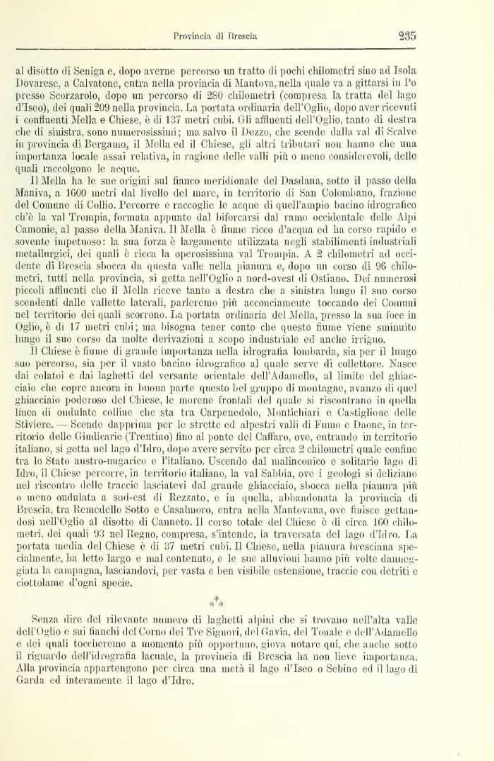 11 Mella ha le sue origini sul fianco meridionale del Dasdana, sotto il passo della Maniva, a 1000 metri dal livello del mare, in territorio di San Colombano, frazione del Comune di Collio. Percorre e raccoglie le acque di quell'ampio bacino idrografico ch'è la vai Tcompia, formata appunto dal biforcarsi dal ramo occidentale delle Alpi Camonie, al passo della Maniva. 11 Mella è fiume ricco d'acqua ed ha corso rapido e sovente impetuoso: la sua forza è largamente utilizzata negli stabilimenti industriali metallurgici, dei quali è ricca la operosissima vai Trompia. A 2 chilometri ad occidente di Brescia sbocca da questa valle nella piantila e, dopo un corso di 96 chilometri, tutti nella provincia, si getta nell'Oglio a nord-ovest di Ostiano. Dei numerosi piccoli affluenti che il Molla riceve tanto a destra che a sinistra lungo il suo corso scendenti dalle vallette laterali, parleremo più acconciamente toccando dei Comuni nel territorio dei quali scorrono. La portata ordinaria del Mella, presso la sua foce in Oglio, è di 17 metri cubi; ina bisogna tener conto che questo fiume viene sminuito lungo il suo corso da molte derivazioni a scopo industriale ed anche irriguo.