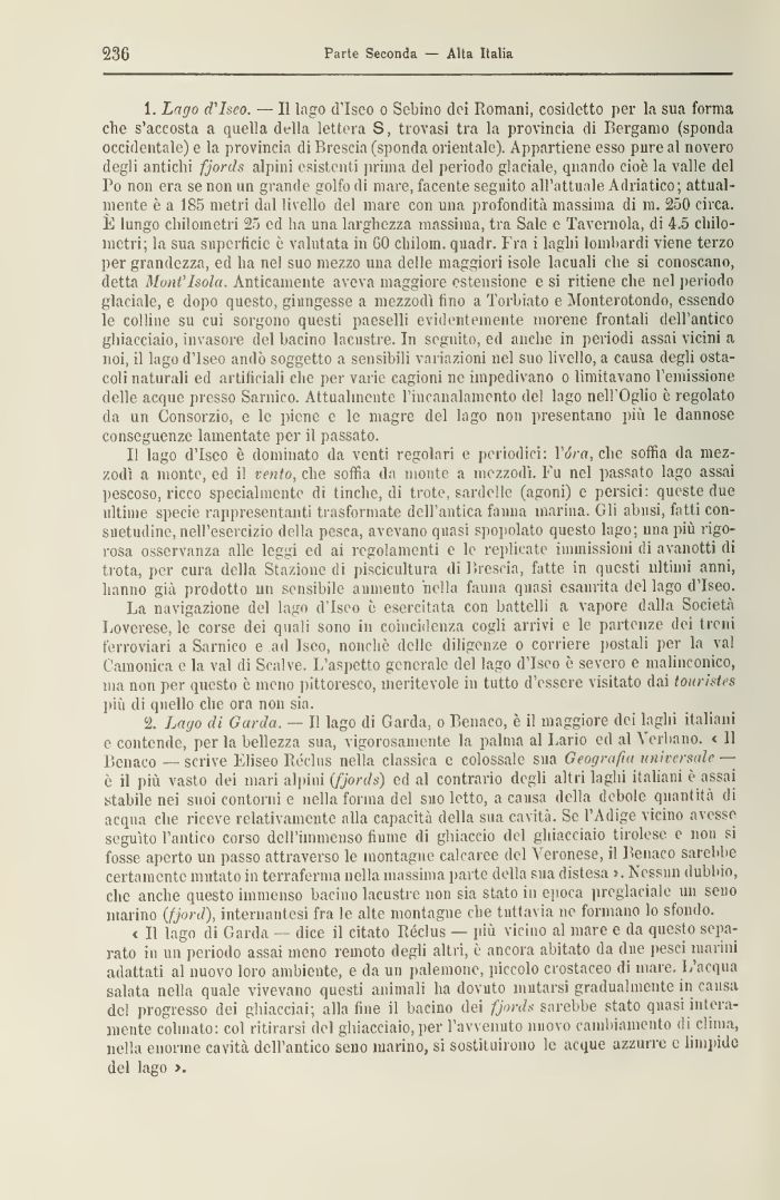 < Il lago di Garda — dice il citato Réclus — più vicino al mare e da questo separato in un periodo assai meno remoto degli altri, è ancora abitato da due pesci marini adattati al nuovo loro ambiente, e da un palemonc, piccolo crostaceo di mare. L'acqua salata nella quale vivevano questi animali ha dovuto mutarsi gradualmente in causa del progresso dei ghiacciai; alla fine il bacino dei fjords sarebbe stato quasi interamente colmato: col ritirarsi del ghiacciaio, per l'avvenuto nuovo cambiamento di clima, nella enorme cavità dell'antico seno marino, si sostituirono le acque azzurre e limpide del lago >.