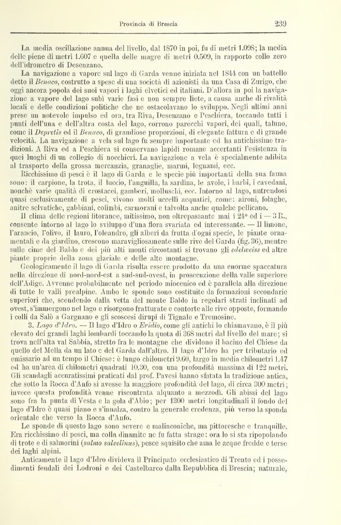 3. Lago d'Idro. — Il lago d'Idro o Ericlio, come gli antichi lo chiamavano, è il più elevato dei grandi laghi lombardi toccandola quota ili 368 metri dal livello del mare; si trova nell'alta vai Sabbia, stretto fra le montagne che dividono il bacino del Chiese da quello delMella da un lato e del Garda dall'altro. Il lago d'Idro ha per tributario ed emissario ad un tempo il Chiese: è lungo chilometri9.60, largo in media chilometri 1.47 ed ha un'area di chilometri quadrati 10.30, con una profondità massima di 122 metri,, Gli scandagli accuratissimi praticati dal prof. Pavesi hanno sfatata la tradizione antica, che sotto la Rocca d'Anfo si avesse la maggiore profondità del lago, di circa 300 metri; invece questa profondità venne riscontrata alquanto a mezzodì. Gli abissi del lago sono fra la punta di Vesta e la gola d'Abio; per 1300 metri longitudinali il fondo del lago d'Idro è (piasi piano e s'innalza, contro la generale credenza, più verso la sponda orientale che verso la Rocca d'Anfo.
