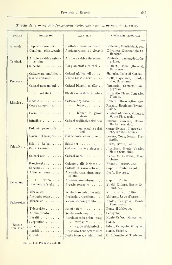 Tavola delle principali formazioni geologiche nella provincia di Brescia.