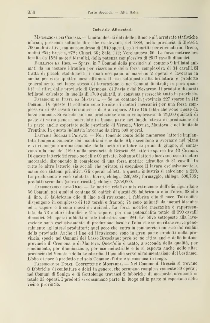 Macinazione dei Cereali. — Limitandoci ai dati delle ultime e già arretrato statistiche ufficiali, possiamo soltanto dire che esistevano, nel 1S82, nella provincia di Brescia 700 mulini attivi, con un complesso di 1940 operai, cosi ripartiti per circondario: Breno, mulini 254; Brescia, 272; Chiari, OC; Salò, 112; Verolanuova, 56. La forza motrice era fornita da 1524 motori idraulici, della potenza complessiva di 2517 cavalli dinamici.