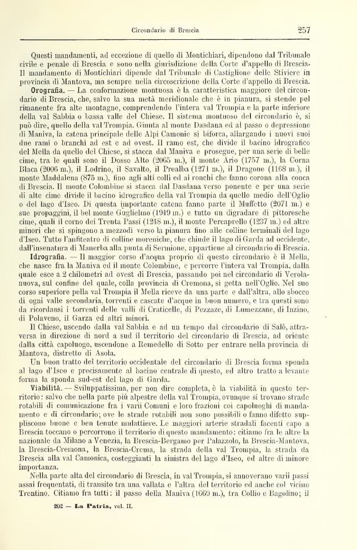 Orografia. — La conformazione montuosa è la caratteristica maggiore del circondario di Brescia, che, salvo la sua metà meridionale che è in pianura, si stende pel rimanente fra alte montagne, comprendendo l'intera vai Trompia e la parte inferiore della vai Sabbia o bassa valle del Chiese. Il sistema montuoso del circondario è, si può dire, quello della vai Trompia. Giunta al monte Dasdana ed al passo o depressione di Maniva, la catena principale delle Alpi Cameni© si biforca, allargando i nuovi suoi due rami o branchi ad est e ad ovest,, Il ramo est, che divide il bacino idrografico del Mella da quello del Chiese, si stacca dal Maniva e prosegue, per una serie di belle cime, tra le quali sono il Dosso Alto (2065 ni.), il monte Ario (1757 111.), la Corna Iliaca (200C m.), il Lodrino, il Savalto, il Brealba (1271 ni.), il Dragone (1168 m.), il monte Maddalena (875 ni.), lino agli alti colti ed ai ronchi che fanno corona alla conca ili Brescia. Il monte Colombine si stacca dal Dasdana verso ponente e per una serie di alte cime diride il bacino idrografico della vai Trompia da quello medio dell'Oglio o del lago d'Iseo. Di questa importante catena fanno parte il Muffetto (2071 ni.) e sue propaggini, il bel monte Guglielmo (1949 m.) e tutto un digradare di pittoresche cime, quali il corno dei Trenta Passi (124S ni.), il monte l'ercaprello (1237 in.) ed altre minori che si spingono a mezzodì verso la pianura tino alle colline terminali del lago d'Iseo. Tutto l'anfiteatro di colline moreniche, che chiude il lago di Garda ad occidente, dall'insenatura di Manerba alla punta di Sermione, appartiene al circondario di Brescia.