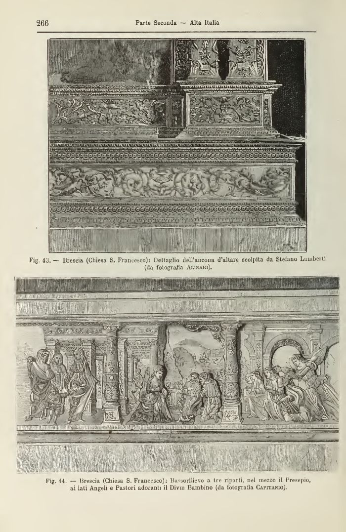 Fig. 44. — Brescia (Chiesa S. Francesco): Bassorilievo a tre riparti, nel mezzo il Presepio, ai lati Angeli e Pastori adoranti il Divin Bambino (da fotogralìa Capitario).