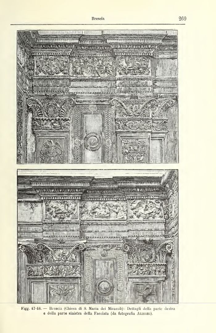 Brescia 269 Figg. 47-48. — Biescia (Chiesa di S. Maria dei Miracoli): Dettagli della parte destra e della parte sinistra della Facciata (da fotografia Alinari).