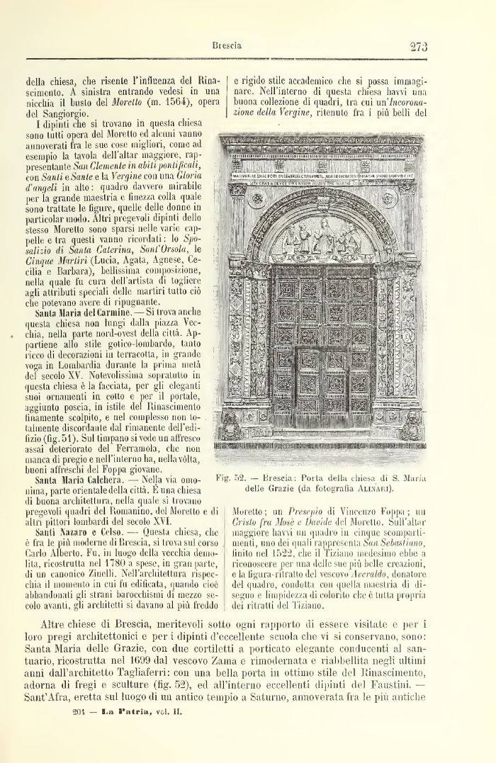 Altre chiese di Brescia, meritevoli sotto ogni rapporto di essere visitate e per i loro pregi architettonici e peri dipinti d'eccellente scuola che vi si conservano, sono: Santa Maria delle Grazie, con due cortiletti a porticato elegante conducenti al santuario, ricostrutta nel 1699 dal vescovo Zanni e rimodernata e riabbellita negli ultimi anni dall'architetto Tagliaferri: con una bella porta in ottimo stile del Rinascimento, adorna di fregi e sculture (fig. 52), ed all'interno eccellenti dipinti del Faustini. — Sant'Afra, eretta sul luogo di un antico tempio a Saturno, annoverata fra le più antiche
