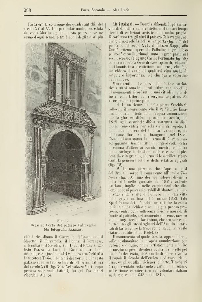 Alili palazzi. — Brescia abbonda di palazzi signorili di bellissima architettura ed in pari tempo ricchi di collezioni artistiche di mollo pregio. Ricordiamo tra gli altri il palazzo Calzaveglio, nel quale è notevole la bellissima porta (fig. 77) del principio del secolo XVI; il palazzo Maggi, alla Carità, iilenulo opera del Palladio; il grandioso palazzo Vescovile, rimodernato in gran parte nel secolo scorso; l'elegante Casino Fortunato (fig. 78) ed una numerosa serie di case signorili, eleganti e di buonissima arcliilellnra moderna, che formerebbero il vanto di qualsiasi città anche di maggiore importanza, ma che qui è supertluo l'enumerare.
