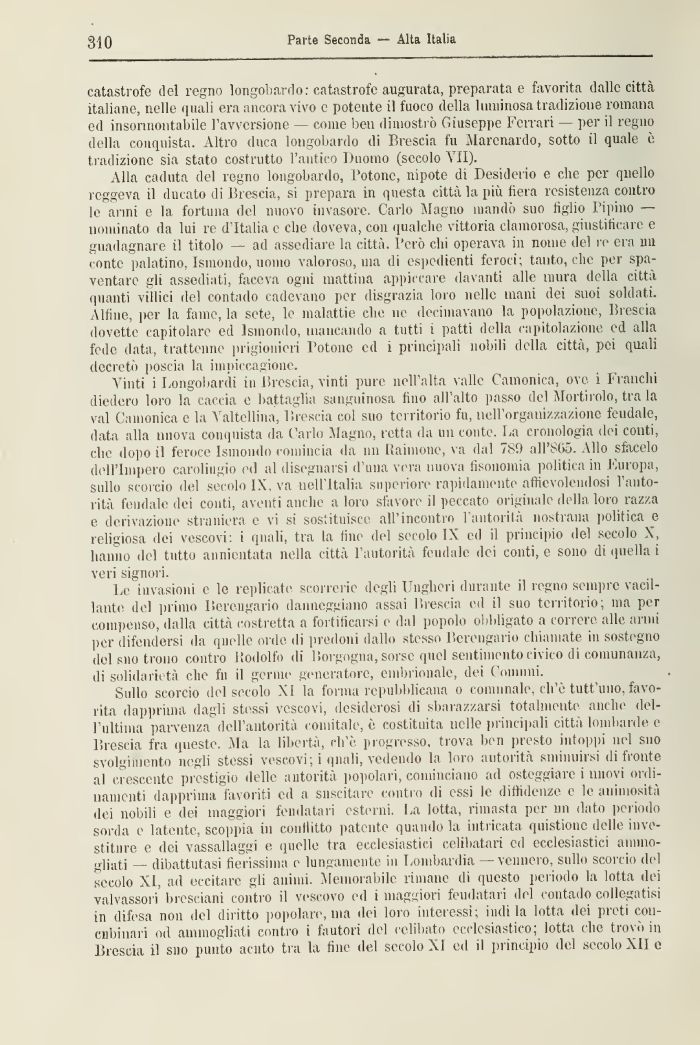 Vinti i Longobardi in Brescia, vinti pure nell'alta valle Camonica, ove i Franchi diedero loro la caccia e battaglia sanguinosa fino all'alto passo del Mortirolo, tra la vai Camonica e la Valtellina, Brescia col suo territorio fu, nell'organizzazione feudale, data alla nuova conquista da Carlo Magno, retta da un conte. La cronologia dei conti, che dopo il feroce Ismondo comincia da ini Raimonc, va dal 789 all'SGG. Mio sfacelo dell'Impero carolingio ed al disegnarsi d'una vera nuova fìsononiia politica in Europa, sullo scorcio del secolo IX, va nell'Italia superiore rapidamente affievolendosi l'autorità fendale dei conti, aventi anche a loro sfavore il peccato originale della loro razza e derivazione straniera e vi si sostituisce all'incontro l'autorità nostrana politica e religiosa dei vescovi: i quali, tra la fine del secolo IX ed il principio del secolo X, hanno del tutto annientata nella città l'autorità feudale dei conti, e sono di quella i veri signori.