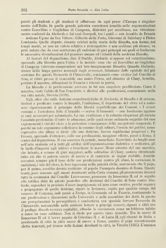 Ai fautori del dogmatismo, dice il Bucklc, Abelardo si oppose col concettualismo, sposando alla filosofia pura l'etica e la inorale: cose clic nò Itoscellino uè Guglielmo di Campenti volevano comprendere nei loro insegnamenti filosofici. Quando Abelardo, stanco della lunga guerra mossagli dagli avversari, fulminato dalle epistole del più acerrimo fra questi, Bernardo di Chiaravalle, condannato come eretico dal Concilio di Sens, si ritirò presso il venerabile suo amico Pietro, nel chiostro di Cluny, Arnaldo, perduto il maestro, abbandonò la Francia e ritornò in patria.