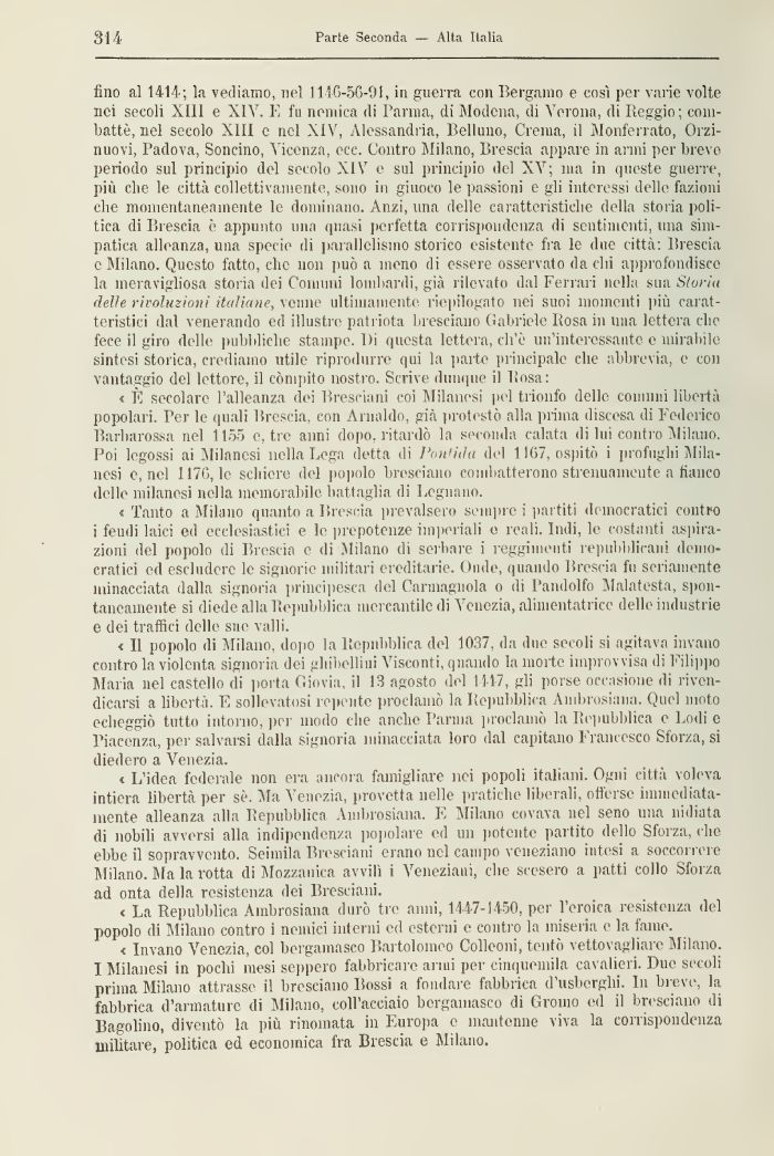 fino al 1414; la vediamo, nel 1116-56-91 s in guerra con Bergamo e così per varie volte nei secoli XIII e XIV. E fu nemica di Parma, di Modena, di Verona, di Reggio; combattè, nel secolo XIII e nel XIV, Alessandria, Belluno, Crema, il Monferrato, Orzi-nuovi, Padova, Soncino, Vicenza, ecc. Contro Milano, Brescia appare in armi per breve periodo sul principio del secolo XIV e sul principio del XV; ma in queste guerre, più che le città collettivamente, sono in giuoco le passioni e gli interessi delle fazioni che momentaneamente le dominano. Anzi, una delle caratteristiche della storia politica di Brescia è appunto una quasi perfetta corrispondenza di sentimenti, una simpatica alleanza, una specie di parallelismo storico esistente fra le due città: Brescia e Milano. Questo fatto, che non può a meno di essere osservato da chi approfondisce la meravigliosa storia dei Comuni lombardi, già rilevato dal Ferrari nella stia Storia delie rivoluzioni italiane, venne ultimamente riepilogato nei suoi momenti più caratteristici dal venerando ed illustre patriota bresciano Gabriele Rosa in una lettera che fece il giro delle pubbliche stampe. Dì questa lettera, cli'è un'interessante e mirabile sintesi storica, crediamo utile riprodurre qui la parte principale che abbrevia, e con vantaggio del lettore, il compito nostro. Scrive dunque il Posa: