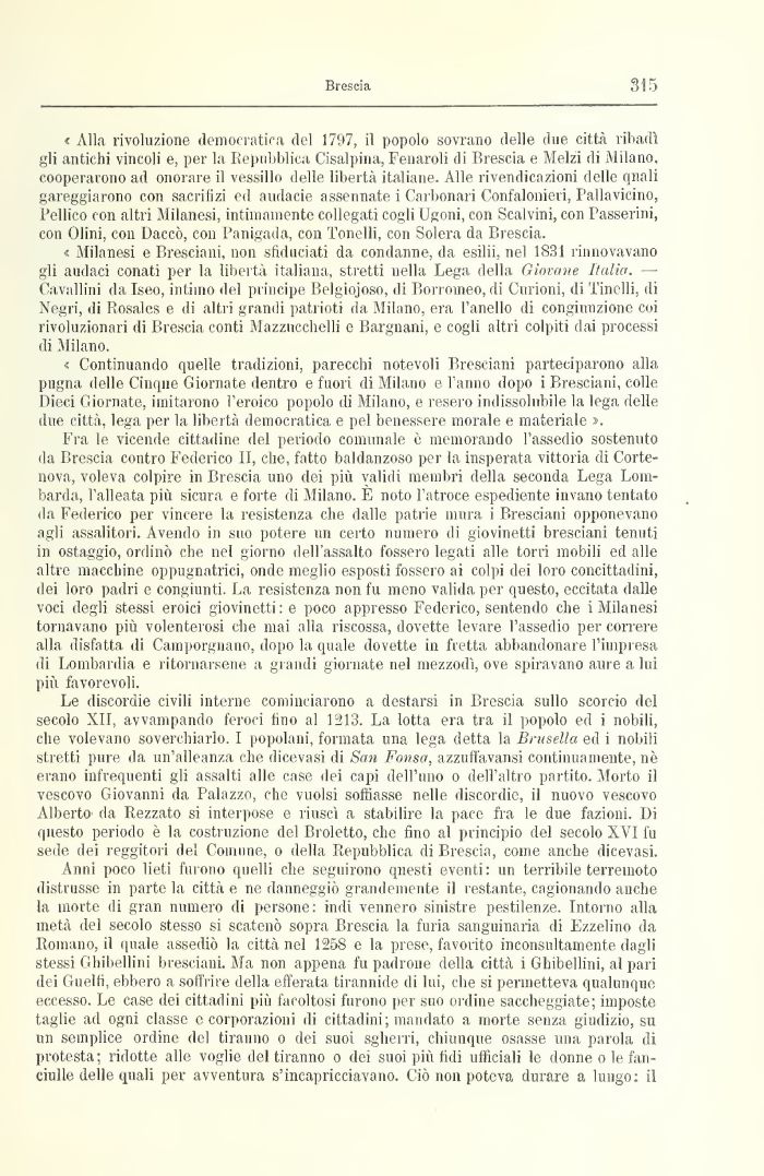 < Continuando quelle tradizioni, parecchi notevoli Bresciani parteciparono alla pugnai delle Cinque Giornate dentro e fuori di Milano e l'anno dopo i Bresciani, colle Dieci Giornate, imitarono l'eroico popolo di Milano, e resero indissolubile la lega delle due città, lega per la libertà democratica e pel benessere morale e materiale ».