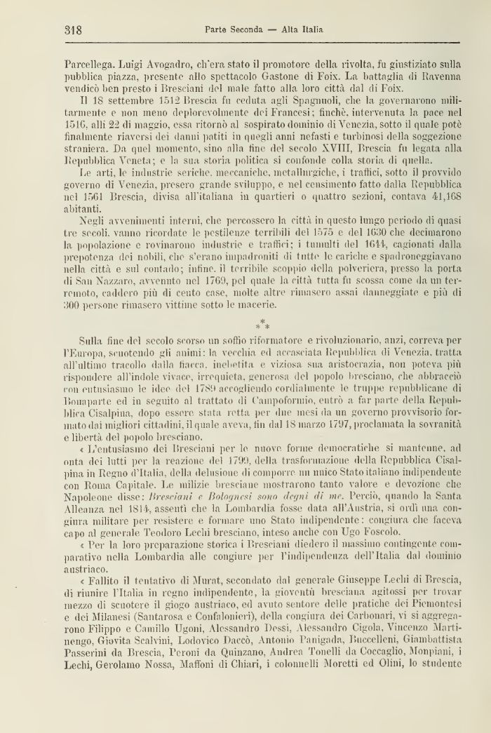 < L'entusiasmo dei Bresciani per le nuove, forme democratiche si mantenne, ad onta dei lutti per la reazione del 1799, della trasformazione della Repubblica Cisalpina in Regno d'Italia, della delusione di comporre un unico Stato italiano indipendente con Roma Capitale. Le milizie bresciane mostrarono tanto valore e devozione che Napoleone disse: liresriani e Bolor/ncsi sono dcf/nì di me. Perciò, (piando la Santa Alleanza nel 1814, assentì che la Lombardia fosse data all'Austria, si ordì una congiura militare per resistere e formare uno Stato indipendente : congiura che faceva capo al generale Teodoro Lechi bresciano, inteso anche con Ugo Foscolo.