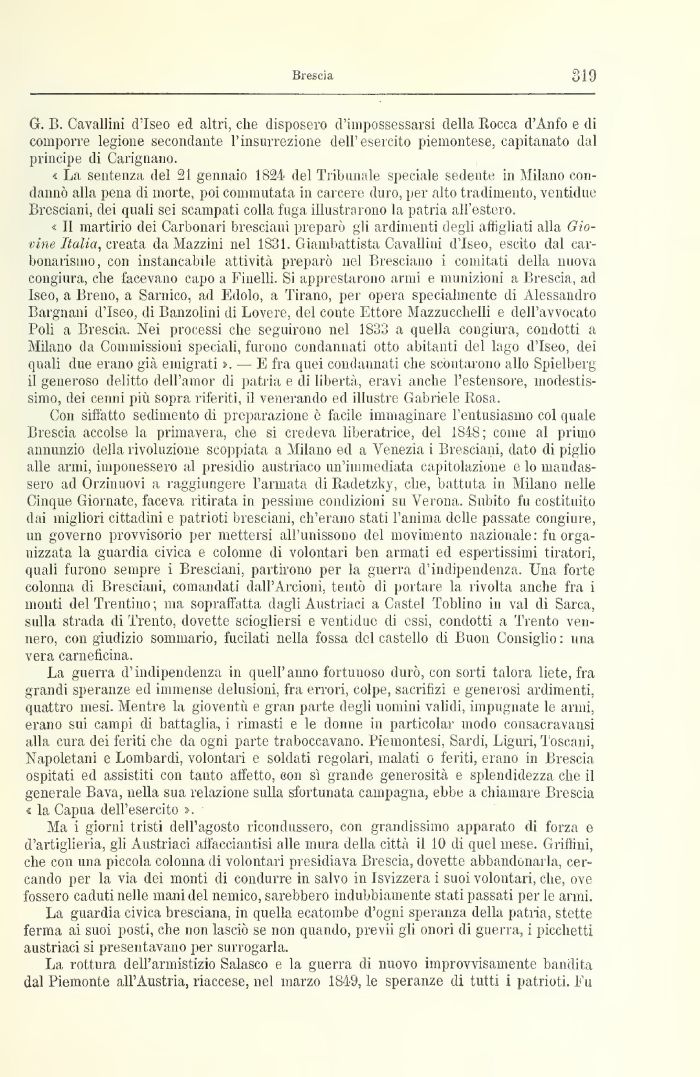 < Il martirio dei Carbonari bresciani preparò gli ardimenti degli affigliati alla Giovine Italia, crenta. da Mazzini nel 1831 Giambattista Cavallini d'Iseo, escito dal carbonarismo, con instancabile attività preparò nel Bresciano i comitati della nuova congiura, che facevano capo a Einelli. Si apprestarono armi e munizioni a Brescia, ad Iseo, a Breno, a Sarnico, ad Edolo, a Tirano, per opera specialmente di Alessandro Bargnani d'Iseo, di Banzolini di Lovere, del conte Ettore Mazzucchelli e dell'avvocato Poli a Brescia. Nei processi che seguirono nel 1833 a quella congiura, condotti a Milano da Commissioni speciali, furono condannati otto abitanti del lago d'Iseo, dei quali due erano già emigrati ». — E fra quei condannati che scontarono allo Spielberg il generoso delitto dell'amor di patria e di libertà, eravi anche l'estensore, modestissimo, dei cenni più sopra riferiti, il venerando ed illustre Gabriele Rosa.