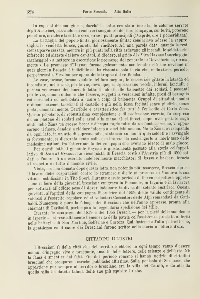 La battaglia del popolo finita, gloriosamente finita: cominciava adesso la rappresaglia, la vendetta feroce, giurata dal vincitore. Ad una parola data, quando la resistenza parve cessata, mentre in più punti della città ardevano gli incendi, le soldatesche inferocite ed aizzate dai loro capitani, si diedero, al grido di < Viva Haynau ! saccheggio! saccheggio! > a mettere in esecuzione le promesse del generale: < Devastazione, rovina, morte ».Le promesse d'Haynau furono gelosamente mantenute: ciò che avvenne in quei giorni a Brescia è indicibile ed ha riscontro solo in ciò che, nello stesso periodo, perpetravasi a Messina per opera delle truppe del re Bomba.