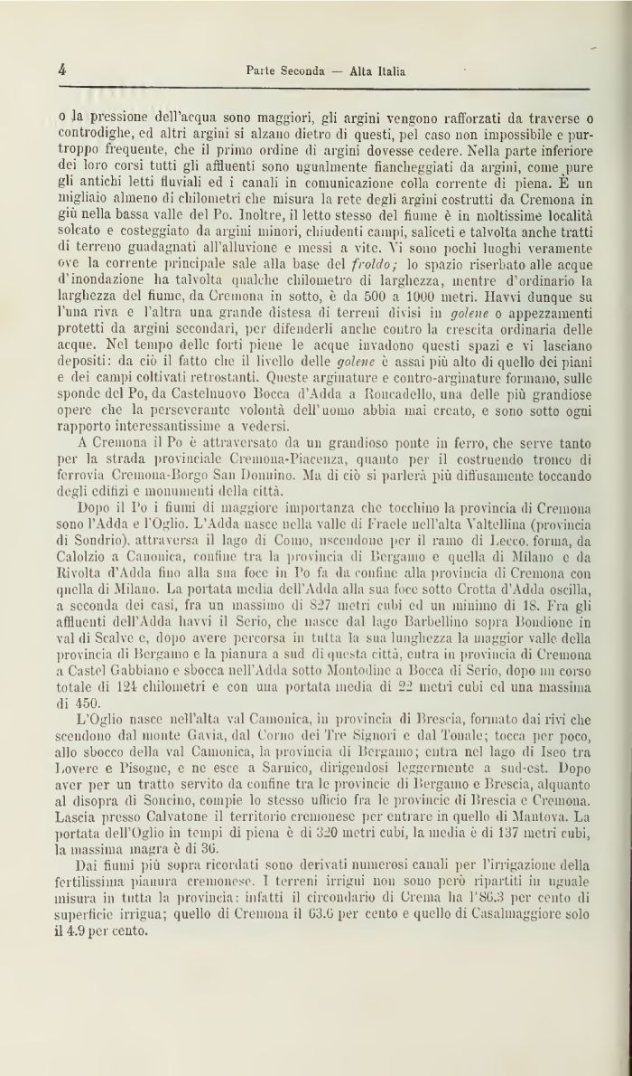 Dopo il Po i fiumi di maggiore importanza che tocchino la provincia di Cremona sono l'Adda e l'Oglio. L'Adda nasce nella valle di Fraele nell'alta Valtellina (provincia di Sondrio), attraversa il lago di Conio, uscendone per il ramo di Lecco, forma, da Calolzio a Canonica, confine tra la provincia di Bergamo e quella di Milano e da Rivolta d'Adda fino alla sua foce in Po fa da confine alla provincia di Cremona con quella di Milano. La portata media dell'Adda alla sua foce sotto Crotta d'Adda oscilla, a seconda dei casi, fra un massimo di S-27 metri cubi ed un minimo dì 1S. Fra gli affluenti dell'Adda havvi il Serio, che nasce dal lago Barbellino sopra Bondione in vai di Scalve e, dopo avere percorsa in tutta la sua lunghezza la maggior valle della provincia di Bergamo e la pianura a sud di questa città, entra in provincia di Cremona a Castel Gabbiano e sbocca nell'Adda sotto Montodine a Bocca di Serio, dopo nn corso totale di 124 chilometri e con una portata inedia di 22 metri cubi ed una massima di 450.
