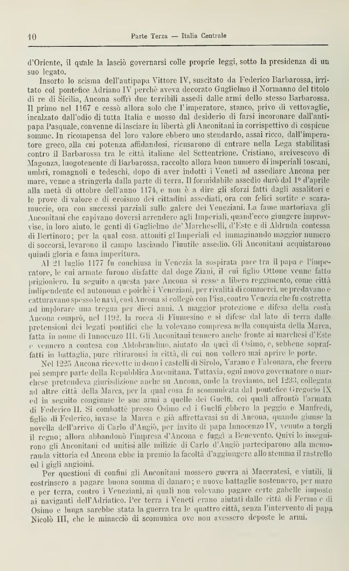 Al L'I luglio 1177 fu conchiusa in Venezia la sospirata pace tra il papa e l'imperatore, le cui armate furono disfatte dal doge Ziani, il cui tiglio Ottone venne fatto prigioniero. In seguito a questa pace Ancona sì resse a libero reggimento, come città indipendente ed autonoma e poiché i Veneziani, per rivalità di commerci, ne predavano e catturavano spesso le navi, così \ncona si collegò con Pisa, contro Venezia che fu costretta ad implorare una tregua per dieci anni. A maggior protezione e difesa della costa Ancona comprò, nel Il!)2, la rocca di Fiumesino e si difese dal lato di terra dalle pretensioni dei legati pentitici che lift volevano compresa nella conquista della Marca, fatta in nome di Innocenzo 111. Gli Anconitani tennero anche fronte ai marchesi d'Kste e vennero a contesa con Aldobrandino, aiutato da quei di Osiino, e, sebbene sopraffatti in battaglia, pure ri ti l'aro usi in città, di cui non vollero mai aprire le porte.
