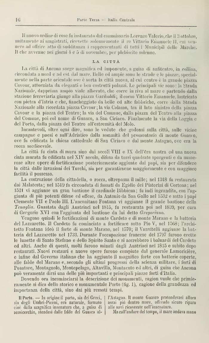 La città di Ancona sorge magnifica ed imponente, a guisa di anfiteatro, in collina, circondata a nord e ad est dal mare, ISelle ed ampie sono le strade e le piazze, specialmente nella parte orientale ove è sorta la città nuova, al cui centro è la granile piazza Cavour, attorniata da eleganti e ben costrutti palazzi. Le principali vie sono: la Strada Nazionale, dapprima ampio \iale alberato, clic corre iu riva al mare e partendo dalla stazione ferroviaria giunge alla piazza Garibaldi; il corso Vittorio Emanuele, lastricato con pietra d'Istria e che, fiancheggiato da belle ed alte fabbriche, corre dalla Strada Nazionale alla ricordata piazza Cavour; la via Calamo, tra il lato sinistro della piazza Cavour e la piazza del Teatro; la via del Comune, dalla piazza del Teatro alla piazza del Comune, poi col nome di Guasco, a San Ciriaco. Filialmente la via della Loggia e del Porto, dalla piazza del Teatro all'estremità del Molo.
