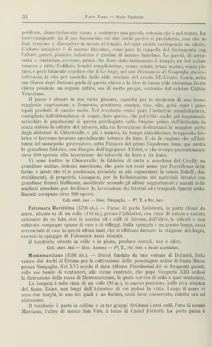 Montemarciano (4591 ab.). — Dicesi fondato da una colonia di Dalmati, fatta venire dai duchi di Urbino per la coltivazione delle prosciugate salme di Santa Maria presso Sinigaglia. Nel XVI secolo il duca Alfonso Piccolomiiii die si frequenti guasti, colle sue bande di venturieri, alle vicine contrade, che papa Gregorio XIII ordinò la distruzione della rocca di Montemarciano, la quale serviva di asilo a quei venturieri.