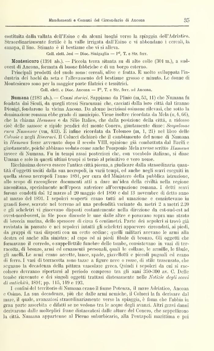 Numana (2183 ab.). — Cenili storici. Sappiamo da Plinio (m,53, 11) che Numana fu fondata dai Siculi, da quegli stessi Siracusani che, cacciati dalla loro città dal tiranno Dionigi, fondarono la vicina Ancona. Da alcune iscrizioni esimane rilevasi, che sotto la dominazione romana ebbe grado di municipio. Viene inoltre ricordata da Mela (ir, 4, (Vi), che la chiama Humana e da Silio Italico, che dalla posizione della città, a ridosso cioè delle sassose e ripide pendici del monte Conero, giustamente disse: Scopidosae ruta Numanae (vui, 433). È infine ricordata da Tolomeo (ni, 1, 21) nel libro delle Colonie e negli Itinerari. Il Colucci dichiarò che il cambiamento del nome di Numana in ìfnmana fosse avvenuto dopo il secolo Vili, opinione già combattuta dal Barili e giustamente, poiché abbiamo veduto come anche Pomponio Mela avesse scritto Humana invece di Numana. Fu in tempi assai posteriori clic, con vocabolo italiano, si disse Umana e solo in questi ultimi tempi si tornò al primitivo e vero nome.