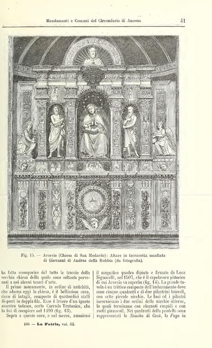 f'ig. 15. — Arcevia (Chiesa di San Medardo) : Altare in terracotta smaltata di Giovanni di Andrea della Robbia (da fotografia).