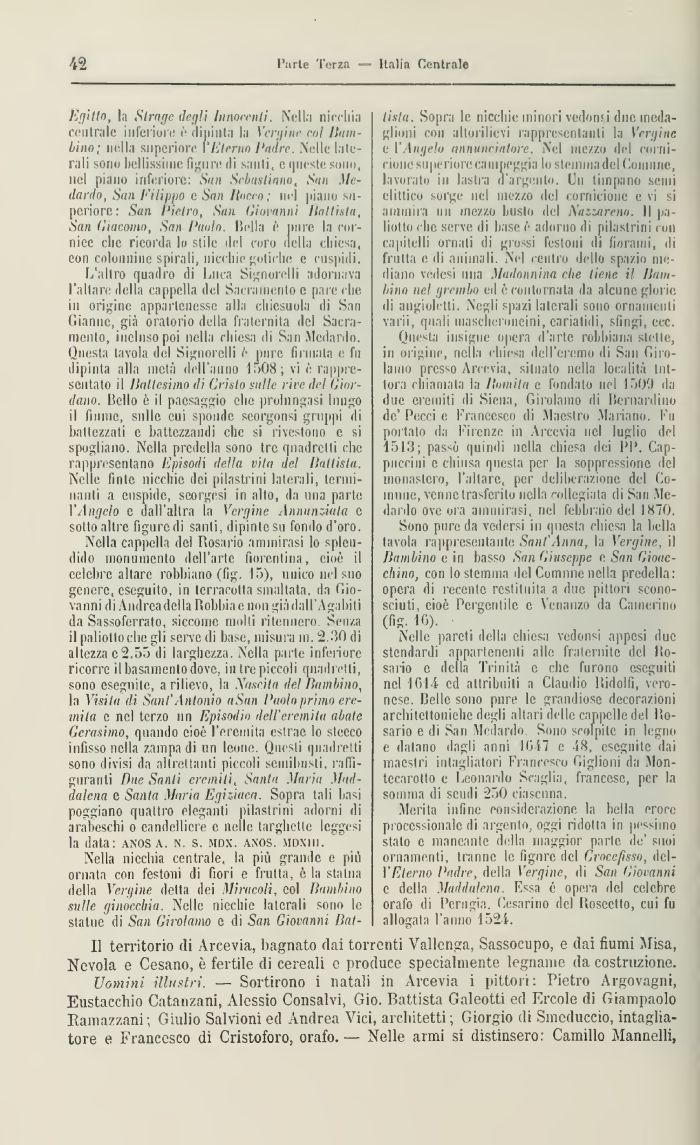 42 Nella nicchia centrale, la più grande e più ornata con festoni di fiori e frutta, è la stallia della Vergine delta ilei Miracoli, eoi Bambino sulle ginocchia. Nelle nicchie laterali sono le statue di San Girolamo e di San Giovanni Bal- lista. Sopra le nicchie minori vedomi due medaglioni con altorilievi rappresentanti la Vergine e l'Angelo annunciatore. Nel mezzo del cornicione Miperiore campeggia lo stemma del Comune, lavorato in lastra d'argento. Un timpano semi clinico sorge nel mezzo del cornicione e vi si ammira un mezzo busto del Nazzareno. Il pali otto clic serve ili base (¦ adorno di pilastrini con capitelli ornali di grossi festoni di fiorami, ili frutta e ili animali. Nel centro dello spazio mediano «illesi ima Madonnina che tiene il Bambino nel grembo ed è contornata ila alcuno glorie di angioletti. Negli spazi laterali sono ornamenti varii, quali niaselieroncini, cariatidi, sfingi, ecc. Onesta insigne opera d'arte rolibiana stelle, iu origine, nella chiesa dell'eremo ili San Girolamo presso Art-evia, situato nella località tuttora chiamata la l'ornila e fondato nel 1500 da due eremiti di Siena, Girolamo di Bernardino de Pecci e Francesco di .Maestro .Mariano. Fu portato da Firenze in Arteria nel luglio del 1513; passò quindi nella chiesa dei l'I'. Cappuccini e chiusa questa per la soppressione del monastero, l'altare, per deliberazione del Comune, venne trasferito nella collegiata di San Me-danlo ove ora ammirasi, nel febbraio del 1K70. Sono pure da vedersi in questa chiesa la bella tavola rappresentante Sant'Anna, la Vergine, il Bambino e, in basso San Giuseppe e San Gioacchino, con lo stemma del Comune nella predella: opera di recente restituita a due pittori sconosciuti, cioè Pcrgcntilc c Vcnanzo da Camerino (fig. 1G). Nelle pareti della chiesa vedonsi apposi due stendardi appartenenti alle fraternitc del Rosario c della Trinità c che furono eseguiti nel Itili ed attribuiti a Claudio lìidolfi, veronese. Belle sono pure le grandiose decorazioni architettoniche degli altari delle cappelle del Rosario e di San Mcdardo. Sono scolpile in legno e datano dagli anni 1017 e 18, eseguite dai maestri intagliatori Francesco Giglioni da Mon-tccarotto e Leonardo Scaglia, francese, per la somma di scudi 250 ciascuna. Merita infine considerazione la bella croce processionale di argento, oggi ridotta in pessimo stato e mancante della maggior parte de' suoi ornamenti, tranne le figure del Cvocc/ìssu, ilcl-l'Eterno Padre, della Vergine, di San Giovanni c delia Maddalena. Rssa é opera del celebre orafo di Perugia. Cesarino del Roscctto, cui fu allogata l'anno 1521. Il territorio di Arcevia, bagnato dai torrenti Vallcnga, Sassocupo, e dai fiumi Misa, Nevola e Cesano, è fertile di cereali e produce specialmente legname da costruzione. Uomini illustri. — Sortirono i natali in Arcevia i pittori : Pietro Argovagni, Eustacchio Catanzani, Alessio Consalvi, Gio. Battista Galeotti ed Ercole di Giampaolo Ramazzami; Giulio Salvionied Andrea Vici, architetti; Giorgio di Smeduccio, intagliatore e Francesco di Cristoforo, orafo.— Nelle armi si distinsero: Camillo Mannelli, ![]() |