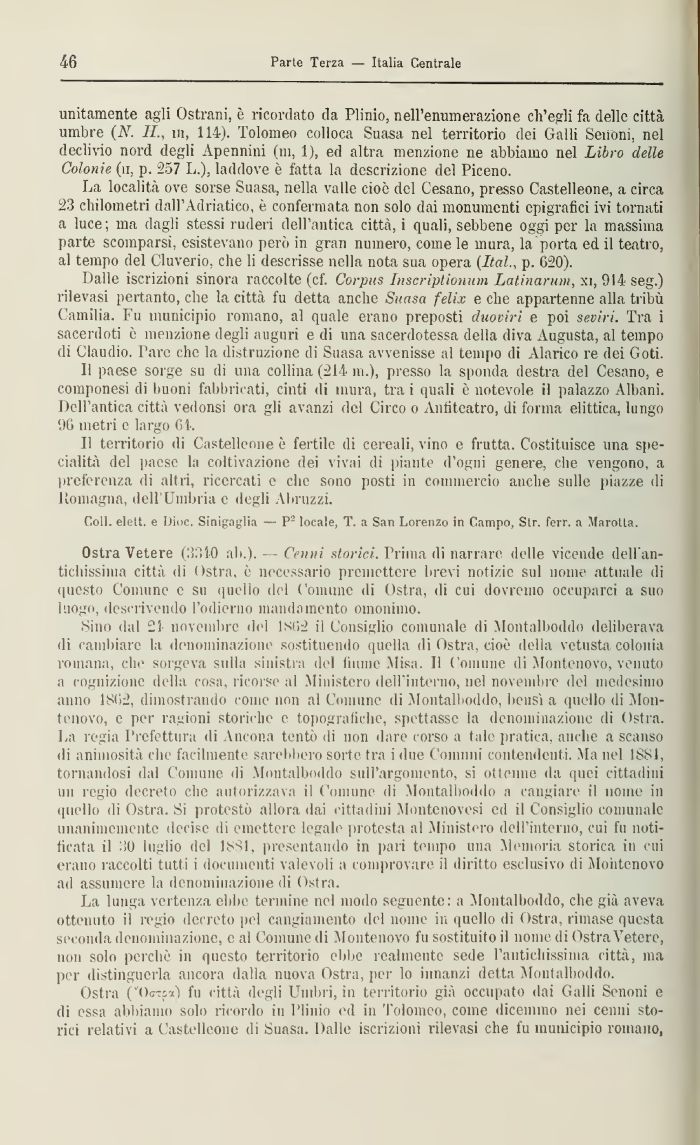 unitamente agli 0 strani, è ricordato da Plinio, nell'emuli orazione ch'egli fa delle città umbre (N. IL, in, 114). Tolomeo colloca Suasa nel territorio dei Galli Seiioni, nel declivio nord degli Apennini (ni, 1), ed altra menzione ne abbiamo nel Libro delle Colonie (ii, p. 257 L.), laddove è fatta la descrizione del Piceno.