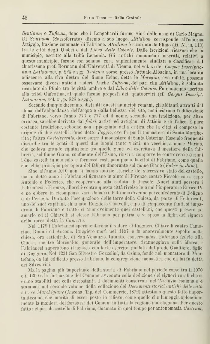 Sentmmn e Tuficum, dopo che i Longobardi furono vinti dalle armi di Carlo Magno. Di Sentinum (Sassoferrato) diremo a suo luogo. Attidium corrisponde all'odierna Attiggio, frazione comunale di Fabriano. Attidium è ricordata da Plinio (IL N.. ni, 113) tra le città degli Umbri e dal Libro delle Colonie. Dalle iscrizioni ricavasi che fu municipio, ascritto alla tribù Lemonia. fili antichi monumenti inscritti, relativi a questo municipio, fnrono con somma cura sapientemente studiati e classificati dal chiarissimo prof. Dormami dell'Università di Vienna, nel voi. xi del Corpus Inscriptio-num Latinorum, p. Sii e sgg. Tuficum sorse presso l'attuale Albacina, in una località adiacente alla riva destra del fiume Esino, detta le Moregim, ove infatti possono osservarsi diversi antichi ruderi. Anche Tuficum, del pari che Attidium, è soltanto ricordato da Plinio tra le città umbre e dal Libro delle Colonie. Fu municipio ascritto alla tribù Oufentina, al quale furono preposti dei quatuorviri (cf. Corpus In script. Latinorum, voi. xi, p. 828 e sgg.).