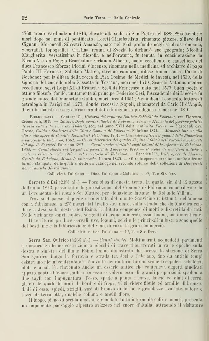 1760, creato cardinale nel 181G, elevato alla sedia di San Pietro nel 1823,2S settembre: morì dopo sei anni di pontificato; Loreti Giambattista, rinomato pittore, allievo del Cignani; Moroncelli Silvestri A malizio, nato nel 1652, profondo negli studi astronomici, geografici, topografici: Cristina regina di Svezia lo dichiarò suo geografo; Nicolini Margherita, versatissinia in filosofia e nell'oratoria, fu tenuta ili considerazione da Nicolò V e da Poggio Bracciolini: Orlando Alberto, poeta eccellente e cancelliere del duca Francesco Sforza; Piccini Vincenzo, rinomato nella medicina ed archiatra di papa Paolo III Farnese; Sabatini Matteo, strenuo capitano, difese Roma contro Carlo di Borbone: per la difesa della rocca di Pisa Cosimo de1 Medici lo investì, nel 1539, della signoria del castello della Sassetta in Toscana, inori nel 1510; Scacchi Antonio, medico eccellente, servì Luigi XI di Francia; Stellati Francesco, nato nel 1577, buon poeta e ottimo filosofo: fondò, unitamente al principe Federico Cesi, l'Accademia dei Lincei e fu grande amico dell'immortale Galilei, mori circa il 1651 ; Venimbeni Leonardo, lettore di astrologia in Parigi liei 1273, donde recossi a Napoli, chiamatovi da Carlo II d'Angiò, di cui fu maestro e segretario: era dotato di memoria prodigiosa e morì nel 1310.