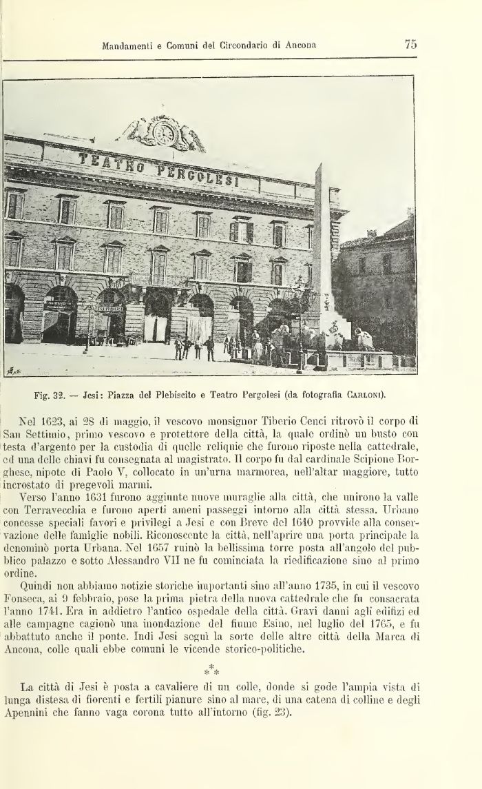 Fig. 32. — Jesi : Fiazza de) Plebiscito c Teatro Pergolesi (da fotografia Carloxi).