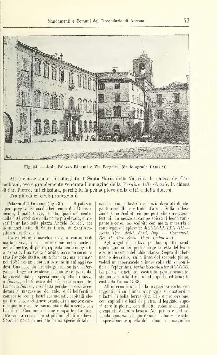 L'arclntettura è maschia e severa, con muri di mattoni vivi, e con decorazione nelle porte e nelle finestre, di pietra, squisitamente intagliale e lavorate. Una svelta e ardita torre ne sormontava l'angolo destro, sulla facciata; ma rovinata Hi 1657 verme ridotta allo stalo in cui oggi ve-desi. Una seconda facciata guarda stilla sia I'er-golesi. Ragguardevolissime sono le tre porte dal iato occidentale, e specialmente quella di mezzo o Suluru, e le finestre della facciata principale. La porla Salarci, cosi detta perché da essa acce-devasi al magazzino del sale, è di bell'ordine composito, con pilastri scannellali, capitelli eleganti e ricco architrave ornato di palmette e cornucopie intrecciate, sormontato dallo scudo con l'arma del Comune, il leone rampante. Le line-sire sono a croce con stipiti intagliali e rilievi. Sopra la porta principale è una specie di taber-