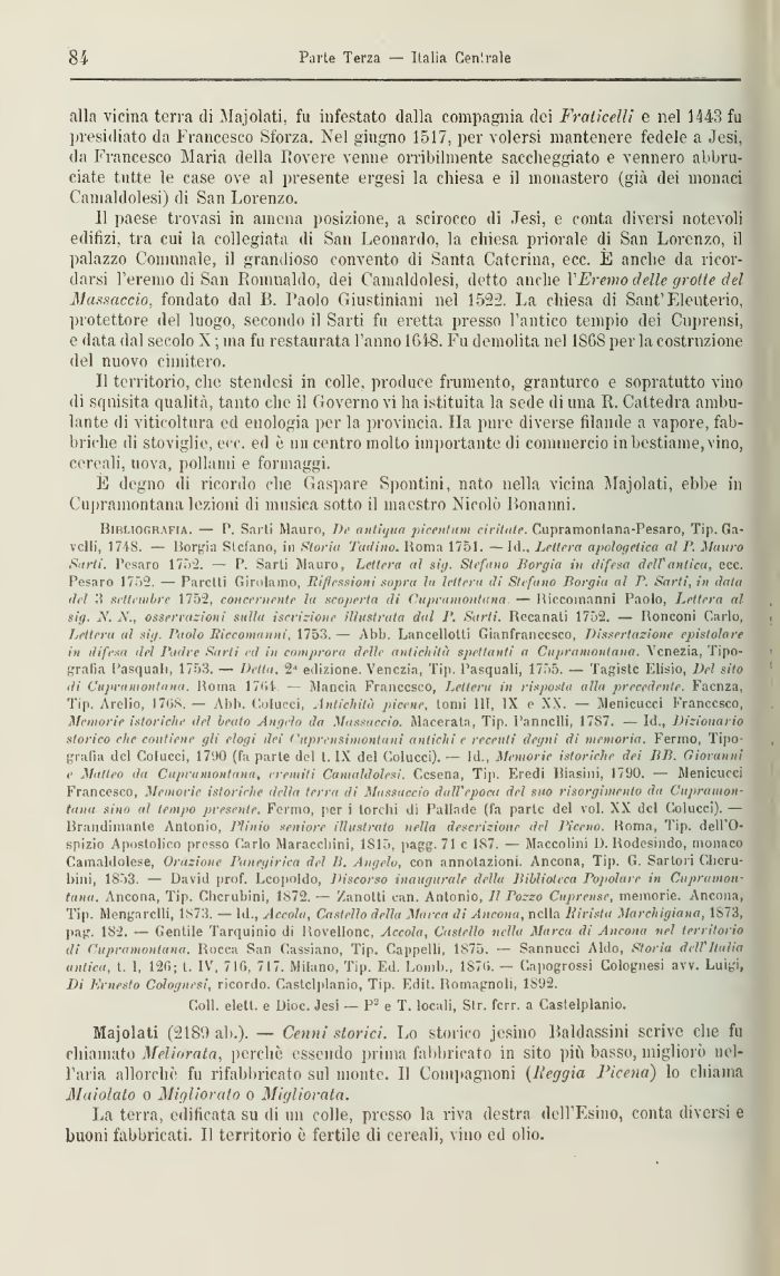 BlM.iOfiRAFlA. — I'. Sarti Mauro, De antiqua pic0́tam ciritute. Cupranionlana-Pesaro, Tip. (́a-vi§!, 17-1S. — Borgia Stefano, in Storia Pallino. Iioma 1751. —Id., Lettera apologetica a! P. Mauro Sarti. Pesaro 1752. — P. Sarti Mauro, Letlei'ti d́ si;/. Stefano Borgia in difesa dell'antica, ecc. Pesaro 1752. — Paretli Girolamo, Riflessioni sopra hi lettera ili Stefano Borgia al P. Sarti, in data del 3 setti adire 1752, concernente hi scojierta di Ca/irunióitana — Hiccoinanni Paolo, Lettera al sig. Ni A'., osservazioni sulla iscrizione illustrata dal P. Sarti. Recanati 1752. — Ronconi Carlo, Lettera al sig. Paolo Ricco/miniti 1753. — Abb. Lancellotti Gianfranccsco, Dissertazione epistolare in difcxa del l'adi e Sarti ed in comprora delle antichità spettanti a Cupramonlana \ cnezia. Tipografia Pasquali 1753. — Detta. 2' edizione. Venezia, Tip. Pasquali, 1755. — Tagistc Elisio, Del sito di Ciijiraniontiina. Homa 1101- Mancia Francesco, Lettera in ri-iponta alla precedente. Faenza, Tip. Arclio, 1708. — Abb. Colucci, 1 litichila picene, torni 111, IX e XX. — Menicucci Francesco, Memorie istoriche ilei beata Angela da Mussacelo. Macerata, Tip. Pannelli, 1787. — Id., iJizionario storico che contiene gli elogi dei ('uprensimotitani antichi e recenti degni di memoria. Ferino Tipografia del Culucci, 17'.)0 (fa parte del t IX del Colucci). — Id., Memorie istoriche dei ÌJ̀. Giovanni e Matteo da Cupramontana, cremiti Camaldolesi. Cesena, Tip. Eredi Biasini, 1790. — Menicucci Francesco, Memorie istoriche delia terra di Mossacelo dall'epoca del suo risorgimento da Cuprauion-tana sino al tempo presente. Fermo, per i torcili di Pallnde (la parte del voi. XX del Colucci). — Brandimarite Antonio, Plinio sentore ili usi rato nella descrizione del Piceno. Boma, Tip. dell'Ospizio Apostolico presso Carlo Marocchini, 1815, pagg. 71 c 187. — Maccolini 1). Rodesmdo, monaco Camaldolese, Orazione Panegirica del ĺ. Angelo, con annotazioni Ancona, Tip. G. Sartori Cherubini, 1853. — David prof. Leopoldo, l'incorso inaugurale della Biblioteca Pojiolare in Ciipriiinon-tana. Ancona, Tip. Cherubini, 1872. — Zanotti can. Antonio, Il Pozzo Cujtrcnse, memorie. Ancona, Tip. Mengarclli, 1S73. — ld., Accolti, Castello della Marca di Ancona, nella lírista Marchigiana, 1S73, pag. 182. — Gentile Tarquinio di Bovellonc, Accola, Castello nella Marca di Ancona nel territorio di Cupramontana. Bocca San Cassiano, Tip. Cappelli, 1875. — Sannucci Aldo, Storia dell'Italia antica, t. 1, 120; t. IV, 710, 717. Milano, Tip. Ed. Loinb., 187(i. — Capogrossi Colognesi avv. Luigi, Di h'rnesto Colognesi, ricordo. Castclplanio, Tip. Edit. Botnagnoll. 1802.