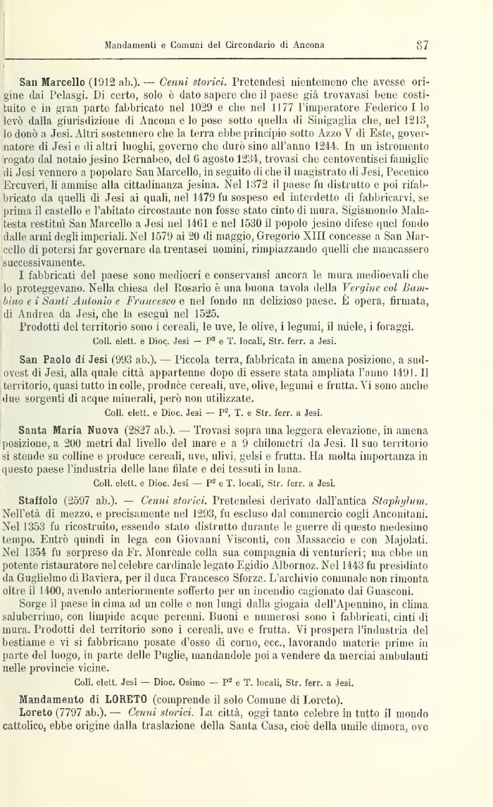 San Marcello (1912 ab.}. — Cenni storici. Pretendesi nientemeno che avesse origine dai Pelasgi. Di certo, solo è dato sapere che il paese già trovavasi bene costituito e in gran parte fabbricato nel 1029 e che nel 1177 l'imperatore Federico I lo levò dalla giurisdizioue di Ancona e lo pose sotto quella di Sinigaglia che, nel 1213 lo donò a Jesi. Altri sostennero che la terra ebbe principio sotto Azzo V di Este, governatore di Jesi e di altri luoghi, governo che durò sino all'anno 1244. In un istroniento rogato dal notaio jesino Rernabeo, del 6 agosto 1234, trovasi che centoventisei famiglie di Jesi vennero a popolare San Marcello, in seguito di che il magistrato di Jesi, Pecenico Ercuveri, li ammise alla cittadinanza jesina. Nel 1372 il paese fu distrutto e poi rifabbricato da quelli di Jesi ai quali, nel 1479 fu sospeso ed interdetto di fabbricarvi, se prima il castello e l'abitato circostante 11011 fosse stato cinto di mura. Sigismondo Mala-testa restituì San Marcello a Jesi nel 14(51 e nel 1530 il popolo jesino difese quel fondo dalle armi degli imperiali. Nel 1579 ai 20 di maggio, Gregorio XIII concesse a San Marcello di potersi far governare da trentasei uomini, rimpiazzando quelli che mancassero [successivamente.
