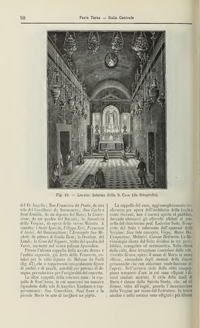La cappella del coro, oggi completamente trasformata per opera dell'architetto della basilica conte Sacconi, non è ancora aperta al pubblico, dovendo ultimarsi gli affreschi affidati al pennello del chiarissimo prof. Lodovico Scitz. 11 concetto del Sciti è informato dall'apoteosi della Vergine: Sine labe concepla, \ irgo, Miller Dei, Conipolicns, Medtalri, Corona Redimila. La 5h-filmologia ideata dal Se.itz dividesi in tre parti: biblica, evangelica ed ecclesiastica. Nella chiave della vòlta, dove irraggiano i costoloni delle, vele, rivestite di rose, spicca il nome di Maria in aureo rilievo, circondato dagli stemmi delle diocesi germaniche clic con oblazione contribuirono all'opera. Nell'azzurro cielo della vòlta campeggiano tempietti d'oro in cui sono effigiati 1 diversi simboli mariani. 11 cielo delle laudi di Maria è chiuso dallo Spirito Santo, che, ad ali dislese, vòlto all'inaili, guarda F incoronazione disila Vergine per mano del Redentore. In trenta nicchie e nella cornice sono effigiati i più illustri