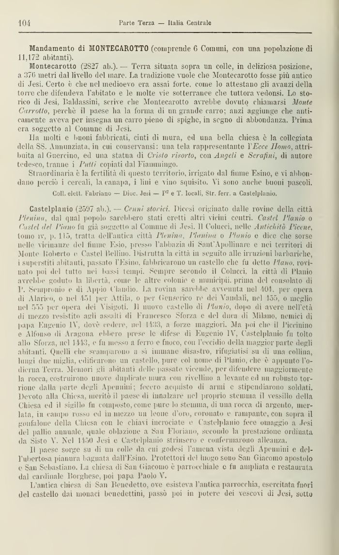 Castelplanio (2507 ab.). — Cenni storici. Dicesi originato dalle rovine della città Platino, dal qua] popolo sarebbero stati eretti altri vicini centri. Castel Planio o Castel del Piano fu già soggetto al Comune di Jesi. Il Colucci, nelle Antichità Picene, tomo ìv, p. 115, tratta dell'antica città PUnina, l'iuuiua o l'ionio e dice che sorse nello vicinanze del fiume F.sio, presso l'abbazia di Sant'Apollinare e nei territori di Monte Iloberto e Castel l'ellino. Distrutta la città in seguito alle irruzioni barbariche, i superstiti abitanti, passato l'Esilio, fabbricarono un castello che fu detto Piatto, rovinato poi del tutto nei bassi tempi. Sempre secondo il Colucci. la città (li Planio avrebbe goduto la libertà, come le altre colonie e iinniiripii, prima del consolato di P. Sempronio e di Appio Claudio. La rovina sarebbe avvenuta nel 404. per opera di Alarico, o nel 451 per \ttila, o per Gcnierico re dei Vandali, nel 155, o meglio nel 555 per opera dei Visigoti, li nuovo castello di l'ianio, dopo di avere nell'età di mezzo resistito agli assalti di Francesco Sforza e del duca di Milano, nemici di papa Eugenio IV, dovè cedi re, nel 1133, a forze maggiori. Ala poi che il Piccinino e Alfonso di Aragona ebbero prese le difese di Fugenio IV, Castelplanio fu tolto allo Sforza, nel 111-3, e fu messo a ferro e fuoco, con l'eccidio della maggior parte degli abitanti. Quelli elio scamparono a si immane disastro, rifugiatisi su di una collina, lungi due miglia, ©liticarono un castello, pure col nome di Planio, che è appunto l'odierna Terra. Memori gli abitanti dì Ile passate vicende, per difendere maggiamente la rocca, costruirono nuove duplicate mura con rivellino a levante ed un robusto torrione dalla parte degli \ pennini; fecero acquisto di armi e stipendiarono soldati. Devoto alla Chiesa, meritò il paeselli innalzare nel proprio stemma il vessillo della Chiesa ed il sigillo fu composto, come pure lo stemma, di una rocca di argento, merlata, in campi rosso ed in mezzo un leone d'oro, coronato e rampante, con sopra il gonfalone della Chiesa con lo chiavi incrociate e Castelplanio fece omaggio a Jesi del pallio annuale, quale oblazione a San Floriano, secondo la prestazioni ordinata da Sisto V. Nel 1150 Jesi e Casti Iplanio strinsero e confermarono alleanza.