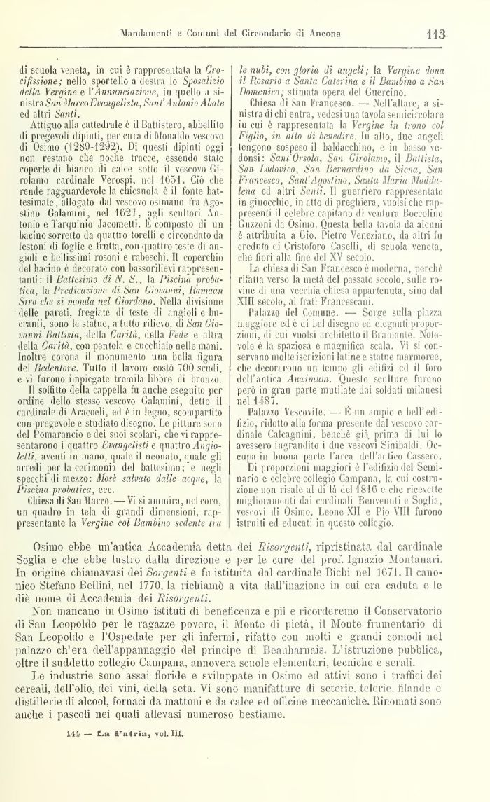 Osimo ebbe un'antica Accademia detta dei Risorgenti, ripristinata dal cardinale Soglia e che ebbe lustro dalla direzione e per le cure del prof. Ignazio Montanari. In origine chiamavasi dei Sorgenti e fu istituita dal cardinale Bichi nel 1671. Il canonico Stefano Bellini, nel 1770, la richiamò a vita dall'inazione in cui era caduta e le die nome di Accademia dei Risorgenti.