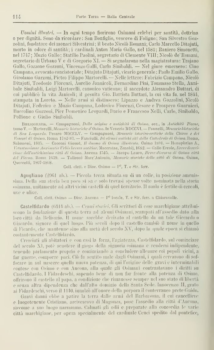 Uomini illustri. — In ogni tempo fiorirono Osimani celebri per santità, dotti-ina o per dignità. Sono da ricordare : San Bonfìglio, vescovo di Foligno ; San Silvestro Goz-zolini. fondatore dei monaci Silvestnni; il beato Nicolò Romani; Carlo Marcello Ditajuti, morto in odore di santità; i cardinali Anton .Maria Gallo, nel 1581; Raniero Simonetti, nel 1747; Muzio Gallo; Statilio Paolini, segretario di Clemente YIII; Nicolò de'Romani, segretario di Urbano V e di Gregorio XI. — Si segnalarono nella magistratura: Trajano Gallo, Cozzone Gozzoni. Vincenzo Galli, Carlo Sinibaldi. — Nel giure emersero: Gino Campana, avvocato concistoriale; Ditajuto Ditajuti, vicario generale: Paolo Emilio Gallo, Girolamo Garzoni, Pietro Filippo Martorelli.— Nelle lettere: Fabrizio Campana, Nicolò Ditajuti, Teodosio Fiorenzi, Aurelio Jannicoli, Bernardino Pini, Tommaso Stella, Annibale Sinibaldi, Luigi Martorelli, canonico vaticano; il sacerdote Alessandro Buttari, di cui pubblicò la vita Janicoli; il gesuita Gio. Battista Buttari. la cui vita fu, nel 1844, stampata in Loreto. — Nelle anni si distinsero: Lipazzo e Andrea Gozzolini, Nicolò Ditajuti, Federico e Muzio Campana, Lodovico Fiorenzi, Cesare e Prospero Guarnieri, Buccolino Guzzoni, Pier Domenico Leopardi, Dario e Francesco Nelli. Carlo, Sinibaldo, Pollione e Giulio Sinibaldi.