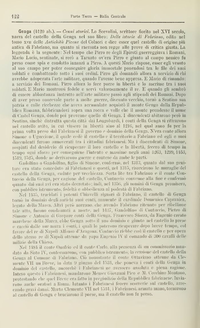 Genga (4120 ab.)- — Cenni storici. Lo Scevolini. scrittore fiorito nel XVI secolo, narra del castello della Genga nel suo libro: Delle istorie di Fabriano, edito nel tomo xvii delle Antichità Picene del Colncci e dice esser quel castello di origine più antica di Fabriano, ma quanto si racconta non regge alle prove di critica giusta. La leggenda è la seguente: Nel tempo che Pirro re degli Epiroti guerreggiava i Romani, Mario Lucio, seminate, si recò a Taranto ov'era Pirro e giunto al campo nemico fu preso come spia e condotto innanzi a Pirro. A questi ìlario rispose, esser egli venuto al suo campo per poter conseguire gloria immortale ponendosi tra le file dei suoi soldati e combattendo sotto i suoi ordini. Pirro gli domandò allora a servizio di chi avrebbe adoperata 1 arte militare, quando l'avesse bene appresa. E Mario di limando: a servizio dei Romani. Pirro allora lo fece porre in libertà e lo ascrisse tra i suoi soldati. E Mario mostrossi fedele e servì valorosamente il te. E quando gli sembrò di essere abbastanza instrutto nell'arte militare passò agli stipendi dei Romani. Uopo di aver preso onorevole parte a molte guerre, divenuto vecchio, tornò a Sentino sua patria e colle ricchezze che aveva accumulate acquistò il monte Gengo dalla Repubblica Romana, fabbricandovi sopra una rocca e volle che il monte prendesse il nome di Castel Genga, donde poi provenne quello di Genga. I discendenti abitarono però in Sentino, sinché distrutta questa città dai Longobardi, i conti della Genga si ritirarono nel castello avito, in cui vissero ili libertà sino al 121(5, nel qual anno fu per la prima volta preso dai Fabrianesi il governo e dominio della Genga. N'era conte allora Simone o Uguccione, il quale cede il castello e il territorio a Fabriano ed egli e suoi discendenti furono annoverati tra i cittadini fabrianesi. Ma i discendenti di Simone, sospinti dal desiderio di ricuperare il loro castello e la libertà, fecero di tempo iu tempo ogni sforzo per conseguirne l'intento e massime negli anni 12G3, 1299, 1453, 1519, 1525, donde ne derivarono guerre e contese da ambe le partì.