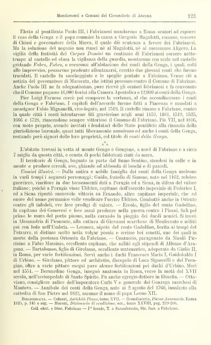Uomini illustri. — Dalla antica e nobile famiglia elei conti della Genga uscirono in varii tempi i seguenti personaggi: Guido, fratello ili Simone, nato nel 1162, celebre guerriero, vincitore in due torneanienti dati a Perugia ed a Siena, in difesa del valore italiano; poiché a Perugia vinse Uldrico, capitano dell'esercito imperiale di Federico I, ed a Siena riportò onorevole vittoria su Emanilo, altro capitano imperiale, che ad onore del nome germanico volle vendicare l'ucciso Uldrico. Combattè anche in Oriente contro gli infedeli, ove fece prodigi di valore. — Ercole, figlio del conte Gadolfino, fu capitano dei Genovesi e fece assai prodezze nella guerra contro i Pisani. Salì pel primo le mura del porto pisano, nulla curando la pioggia dei dardi nemici. Si trovò in Alessandria di Piemonte, alla cattura di Giovanni marchese di Monferrato e militò poi con lode nell'Umbria. — Leonora, nipote del conte Gadolfino, fiorita ai tempi del Petrarca, si distinse molto nella volgar poesia e scrisse bei sonetti, uno dei quali in morte della poetessa Ortensia da Fabriano. — Contuccio, paragonato da Nicolò Piccinino a Fabio Massimo, eccellente capitano, che militò agli stipendi di Alfonso d'Aragona. — Bartolomeo, figlio di Girolamo, eccellente matematico, adoperato da Giulio II, in Roma, per varie fortificazioni. Servì anche i ducili Francesco Maria I, Guidobaldo I di Urbino. — Girolamo, pittore ed architetto, discepolo ili Luca Signorelli e del Perugino, oltre a varie pitture eseguì pure alcune fortilicazioni pei duchi d'Urbino. Morì nel 1551. — Bernardino Genga, insegnò anatomia in Roma, verso la metà del XVII secolo, nell'arciospedale di Santo Spirito. Fu anche egregio dottore in filosofia. — Ottaviano, consigliere aulico dell'imperatore Carlo V e generale dei Gonzaga marchesi di Mantova. — Annibale dei conti della Genga, nato ai 2 agosto del 1760, innalzato alla cattedra di San Pietro nel 1823, assunse il nome di papa Leone XII.