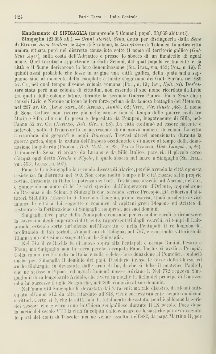 Sinigaglia (23,085 ali.). — Cenni storici. Sena, detta per distinguerla dalla Sena di Etruria, Sena Gallica, la a di Strabene, la -vn y-lìlui di Tolomeo, fu antica città umbra, situata però nel distretto conosciuto sotto il nome di territorio gallico (Gal-deus Ager), sulla costa dell'Adriatico e presso lo sbocco di un fiumieello di egual nome. Quel territorio appartenne ai Galli Senoni, dal qual popolo certamente e la città e il fiume derivarono la loro denominazione (Sil. Iial., vm. 453; I'ol., n, 19). E quindi assai probabile die fosse in origine una città gallica, della quale nulla sappiamo sino al momento della completa e finale soggezione dei Galli Senoni, nel 289 av. Cr., nel qual tempo divenne colonia romana (Poi.., il, 19; Liv., Epit., xi). Dev'essere stata però una colonia di cittadini, non essendo il suo nome ricordato da Livio tra quelli delle colonie latine, durante la seconda Guerra Punica. Fu a Sena clic i consoli Livio e Nerone unirono le loro forze, prima della famosa battaglia del Vie tauro, nel 207 av. Cr. (Limo, xxvii, 46; Appjax., Annih., 52: Yrrr., l'ir. Ulustr.,48). Il nome di Sena Gallica non ricorre più nelle istorie sino al tempo delle guerre civili tra Mario e Siila, allorché fu presa e depredata da Pompeo, luogotenente di Siila, nell'anno 82 av. Cr. (Ai'imano, Bell. Cir., ì, SS). La città continuò ad essere fiorente e notevole; sotto il Triumvirato fu accresciuta di un nuovo numero di coloni. La città è ricordata dai geografi e negli Itinerari. Trovasi altresì menzionata durante la guerra gotica, dopo la caduta dell'Impero occidentale e di nuovo al tempo della dominazione longobarda (Pnocop., Iteli. Golii., tv, 23 ; Paolo Diacono, llist. Laiu/ob., 11, 22). 11 fi inaiceli o Sena, ricordato da Lucano e da Silio Italico, pare sia il piccolo corso d'acqua oggi detto Xecola o A'/yo/a, il quale sbocca nel mare a Sinigaglia (Sil. Ital., vili, 453; Luca.w, u, 407).