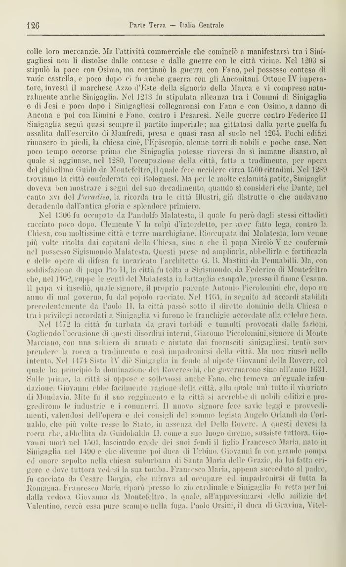colle loro mercanzie. Ma l'attività commerciale che cominciò a manifestarsi tra i Sini-gagliesi non li distolse dalle contese e dalle guerre con le città vicine. Nel 1203 si stipulò la pace con Osimo, ina continnò la guerra con Fano, pel possesso conteso di varie castella, e poco dopo ci fu anche guerra con gli Anconitani. Ottone IV imperatore, investi il marchese Azza d'Este della signoria della Marca e \i comprese, naturalmente anche Shiigaglia. Nel 1213 fu stipulata alleanza tra i Comuni di Sinigaglia e di Jesi e poco dopo i Sinigagliesi collegaronsi con Fano e con Osimo, a danno di Ancona e poi con llimini e Fano, contro i Pesaresi. Nelle guerre contro Federico II Sinigaglia segni quasi sempre il partito imperiale; ma gittatasi dalla parte guelfa fu assalita dall'esercito di Manfredi, presa e quasi rasa al snolo nel 12G4. Pochi edilizi rimasero in piedi, la chiesa cioè, l'Episcopio, alcune torri di nobili e poche case. Non poco tempo occorse prima che Sinigaglia potesse riaversi da sì immane disastro, al quale si aggiunse, ned 12S0, l'occupazione della città, fatta a tradimento, per opera del ghibellino Olialo da Monti/feltro, il quale fece uccidere circa 1500 cittadini. Nel 1289 troviamo la città confederata coi Bolognesi. Ma per le molte calamità patite, Sinigaglia doveva ben mostrare i segni del suo decadimento, quando si consideri che Dante, nel canto xvi del Paradiso, la ricorda tra le città illustri, già distrutte o che andavano decadendo dall'antica gloria e splendore primiero.