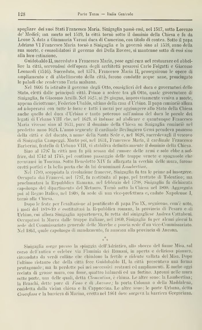 Sinigaglia sorge presso la spiaggia dell' Vdriatìco, allo sbocco del fiume Misa. sul corso dell antica e celebre via Flaminia dei Romani, in aperta e deliziosa pianili a, circondata da verdi colline che chiudono la fertile e ridente vallata del Misa. Dopo 1 ultimo rista uro che della citta fece Guidobaldo li, la città presentava mia forma pentagonale; ma la perdette poi nei .successivi restauri ed ampliamenti. E anche oggi recinta di grosse mura, con fosse, quattro baluardi ed un fortino. Apronsi nelle mura sette porte, una delle (piali, detta Clementina, è chiusa. Le altre sono: la Lambert ina; la ISraschi, dette puro di Fano e di Ancona; la porta Colonna o della Maddalena, cosidetta dalla vigìlia chiesa e la Cappuccina. Le altre sono: le porte Urbana, detta Crocefissa e la barriera di Marina, eretta nel 1801 dove sorgeva la barriera Gregoriana.