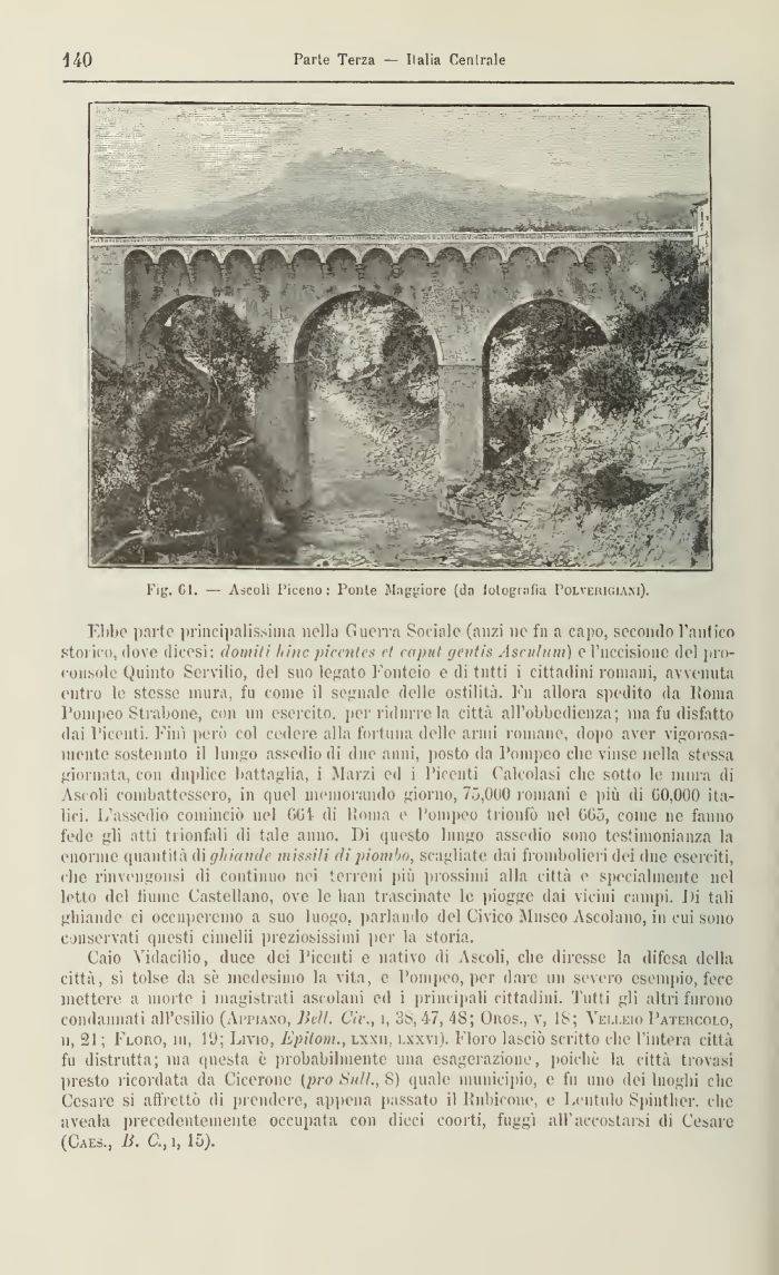 Fillio parte principalissima nella Guerra Sociale (anzi ne fn a capo, secondo l'antico storico, dove dicesi: domiti lune piccntes et caput geutis Ascidiiin) e l'uccisione del proconsole Quinto Servilio, del suo legato Fonteio e di tutti i cittadini romani, avvenuta entro le stesse mura, fu come il segnale delle ostilità. Fn allora Spedito da Poma Pompeo Strabene, con un esercito, per ridurre la città all'obbedienza; ma fu disfatto dai Picenti. l'ini però col cedere alla fortuna delle armi romane, dopo aver vigorosamente sostenuto il lungo assedio dì due anni, posto da Pompeo clic vinse nella stessa giornata, con duplice battaglia, i Marzi ed i Picenti Calcolasi che sotto le mura di Ascoli combattessero, in quel memorando giorno, 75,0(J0 romani e più di 00,000 italici. L'assedio cominciò nel COI- di lìoma e Pompeo ti ionio nel 005, come ne fanno fede gli atti trionfali di tale anno. I)i questo lungo assedio sono testimonianza la enorme (piantila di ghiande missili di piombo, scagliate dai frombolieri dei due eserciti, che rinvengonsi di continuo nei terreni più prossimi alla città e specialmente nel letto del litiine Castellano, ove le han trascinate le piogge dai vicini campi. Di tali ghiande ci occuperemo a suo luogo, parlando del Civico Museo Ascolano, in cui sono conservati questi cimelii preziosissimi per la storia.